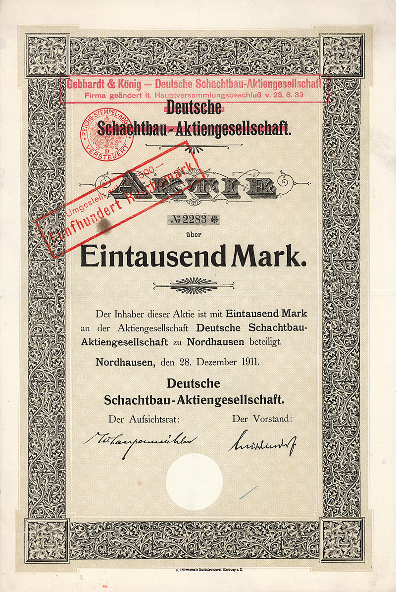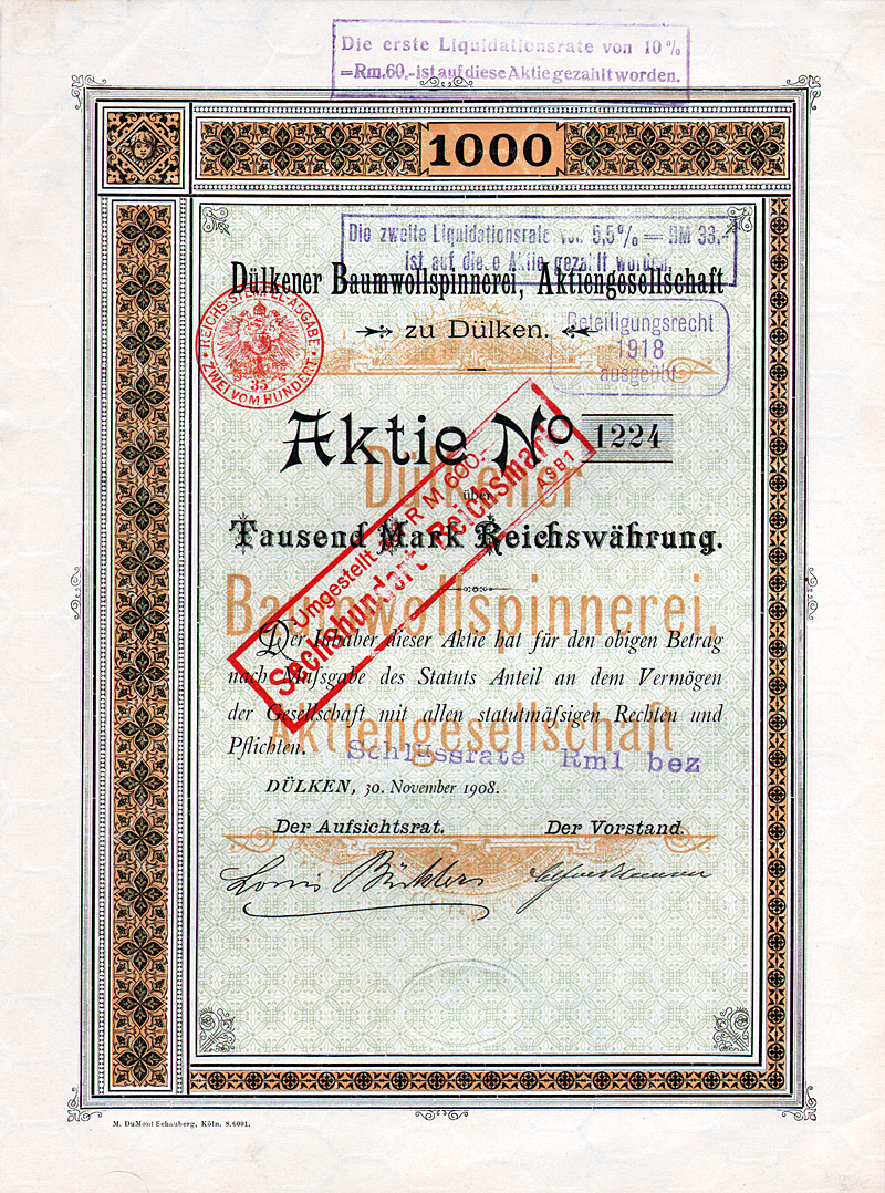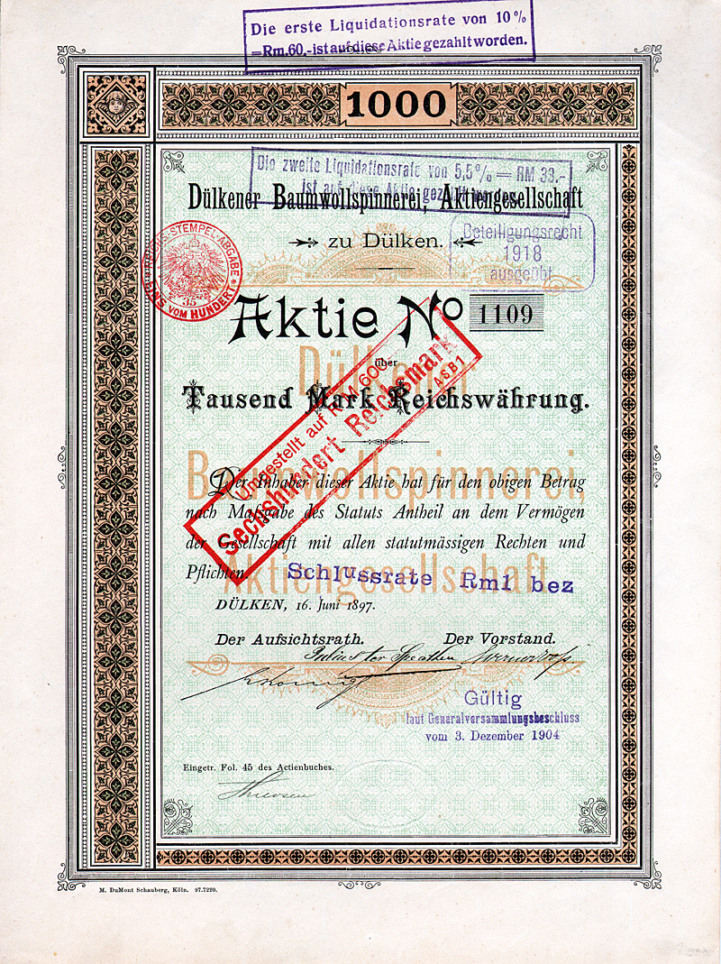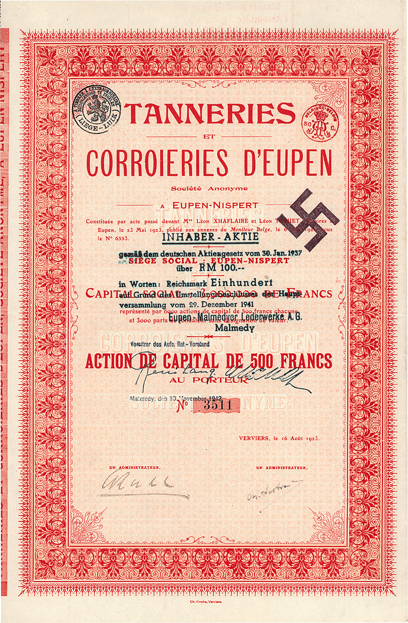 Überdruck auf Action de 500 Francs, Verviers 16.8.1923. Gründung 1923 als “Tanneries et Corroieries d’Eupen S.A.”, eingetragen im Handelsregister von Verviers (Belgien). Der Kreis Malmedy geht auf eine in 7. Jh. gegründete reichsunmittelbare Benediktinerabtei zurück; 1815 wurde er Teil des preußischen Regierungsbezirks Aachen. Schon im 19. Jh. werden die “bedeutenden Gerbereien und Sohllederfabriken” sogar im Brockhaus erwähnt. Ende 1941 Anpassung der Satzung an das deutsche Aktiengesetz und Kapitalumstellung von 3,5 Mio. bfrs auf 1,05 Mio. RM (eingeteilt in 10500 Aktien zu 100 RM). Maße: 36,8 x 24 cm. Mit anhängenden restlichen Kupons. Geschichtlich hochinteressant!