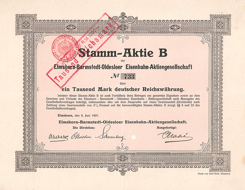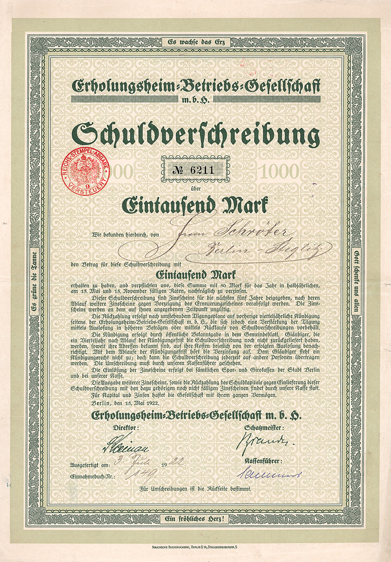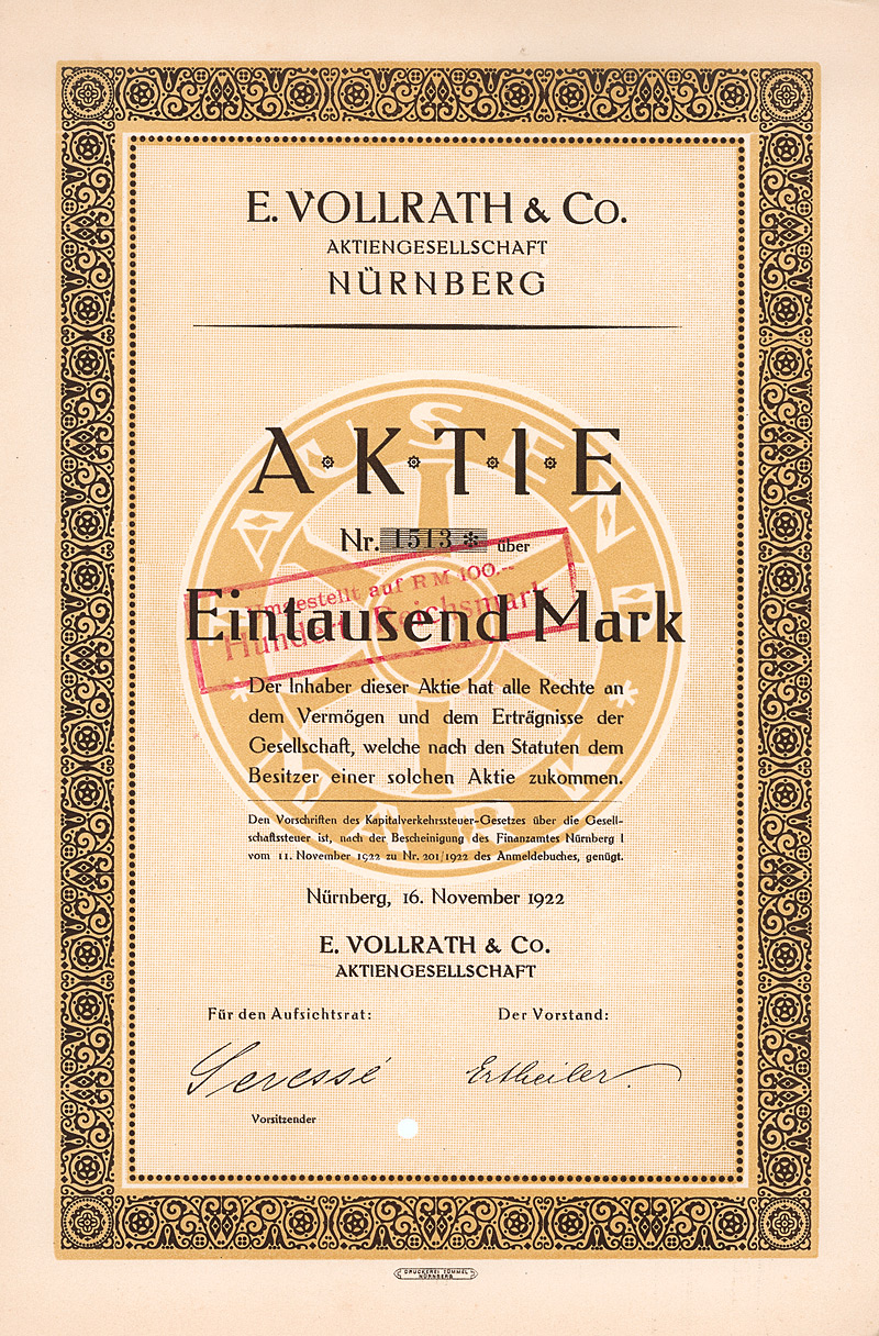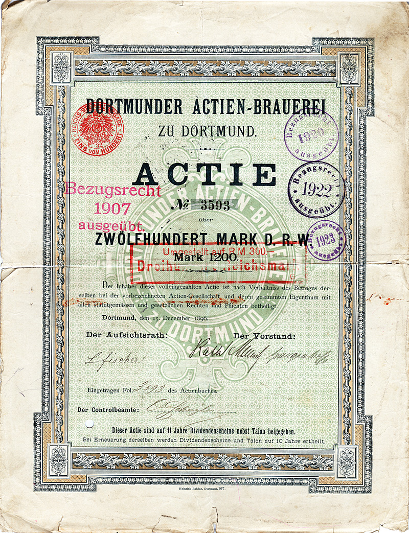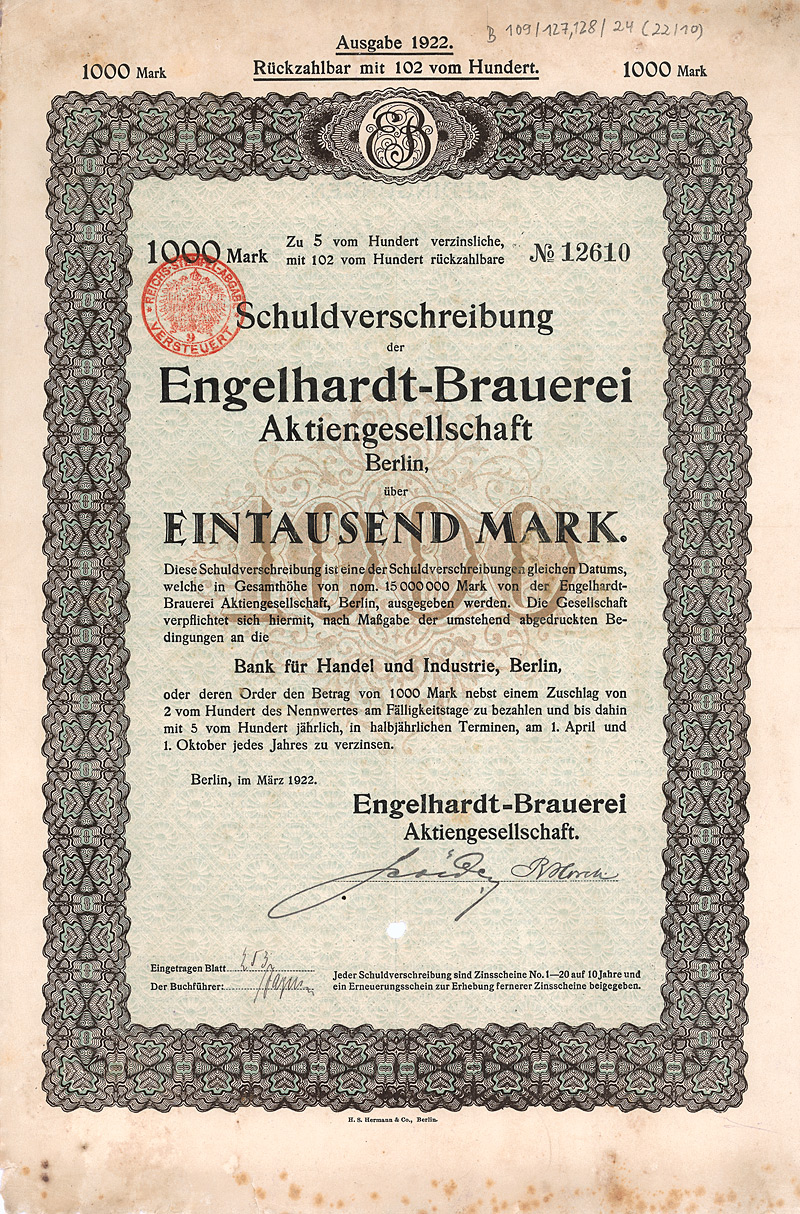 Auflage 11.000 (R 10). Gründung ca. 1860, AG seit 1907. Zunächst eine kleine Brauerei, die namentlich Caramel-Malzbier herstellte. 1905 Errichtung einer großen neuen Brauerei in Pankow. 1910 Verschmelzung mit der Kaiserbrauerei AG in Charlottenburg. 1916/17 Übernahme der Berliner Stadtbrauerei GmbH und der Gebhardt-Weißbierbrauerei GmbH. 1917 Fusion mit der Victoria-Brauerei AG in Stralau. Damit hatte Engelhardt drei Produktionsstätten in Groß-Berlin. In der Folge wurden im ganzen Reich von Wuppertal über Dortmund und Hamburg bis Königsberg i.Pr. dutzende weiterer Brauereien übernommen. Die beiden Braustätten in Pankow (Thulestraße) und Stralau (Krachtstraße) wurden 1949 enteignet. Die Brauerei in Charlottenburg (Danckelmannstraße) wurde 1983 stillgelegt und die Produktion in die Schultheiss-Brauerei in Kreuzberg verlagert, zugleich Abschluß eines Lohnbrauvertrages mit dem Großaktionär Brau und Brunnen AG. 1990 in eine GmbH umgewandelt. Originalunterschriften. Lochentwertet. Maße: 37,9 x 25 cm. Doppelblatt, inwendig Anleihebedingungen. Oben und unten etwas stockflecki, unterer Rand leicht ausgefranst. Nur 3 Stücke sind bis heute erhalten geblieben, alle in nicht so gutem Zustand.