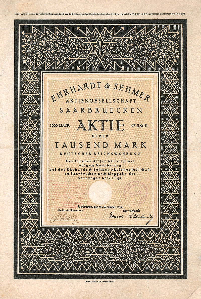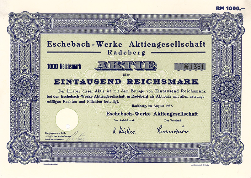 Auflage 1.450 (R 8). Die Werke in Dresden (Eschebach & Haussner, gegr. 1867) und Radeberg (Radeberger Guss- und Emaillierwerke Carl Eschebach & Comp., gegr. 1886) wurden 1890 in der “Vereinigte Eschebach’sche Werke AG” vereint. Hergestellt wurden: Badeöfen, Wannen, Armaturen, Klosetts; Geräte für Konditoreien, Fleischereien, Molkereien; Eisschränke; Küchen-, Schlafzimmer- und Gartenmöbel; Waschtische und Waschschränke für Ärzte; Gaskocher, Herde, Gasheizöfen und Heisswasserautomaten. In der Weltwirtschaftskrise 1931/32 Konzentration der Fertigung in Radeberg, das Dresdner Werk wurde verkauft. Gleichzeitig umbenannt wie oben. Börsennotiz Dresden/Leipzig, doch lagen zuletzt fast 100 % der Aktien beim Wettbewerber Alexanderwerk AG, Remscheid. Die AG selbst verlegte ihren Sitz 1950 nach Remscheid und wurde dann in eine GmbH umgewandelt. Das in der DDR enteignete Werk in Radeberg produzierte nach 1945 Küchenmöbel und wurde 1972 dem VEB Möbelkombinat Hellerau angeschlossen. 1990 reprivatisiert, aber schon im Jahr darauf insolvent geworden. Nach häufigen Eigentümerwechseln kam nach der zweiten Insolvenz 2004 die Produktionseinstellung. An den einstigen Traditionsbetrieb erinnert nur noch das nach der Wende eingerichtete Küchenmuseum, das sich heute im Radeberger Heimatmuseum Schloß Klippenstein befindet. Maße: 21,1 x 29,8 cm. Prägesiegel lochentwertet.
