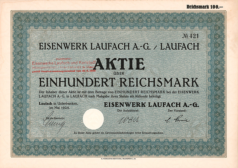 Auflage 500. Gründung 1839 zur Beschäftigung der notleidenden Weber des Riesengebirges durch die Königliche Seehandlungs-Societät (später: Preußische Staatsbank) im Rahmen der Industrialisierungspolitik ihres berühmten Präsidenten Rother. Seit 1872 AG. 1882 Anschluß an die neueröffnete Eisenbahn Hirschberg-Schmiedeberg. Der Mehrheitsaktionär (Blumenberg-Konzern) wurde in der Weltwirtschaftskrise schwach, woraufhin Commerzbank, Deutsche und Dresdner Bank die Mehrheit an der in Berlin und Breslau börsennotierten Ges. übernahmen. Im Betrieb waren zuletzt aufgestellt 14.000 Flachsspindeln und 530 mech. Webstühle, außerdem wurde ein eigenes Hotel mit Gastwirtschaft unterhalten. Maße: 21 x 29,8 cm. Prägesiegel lochentwertet.