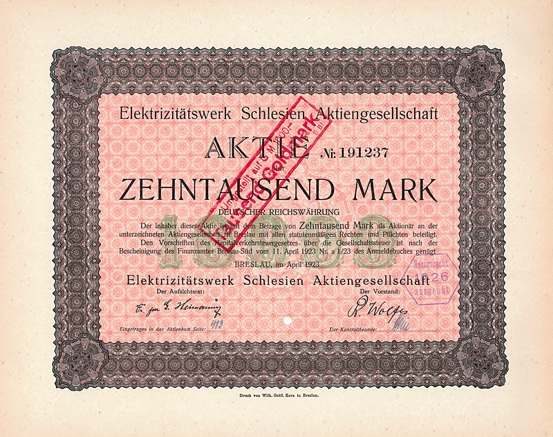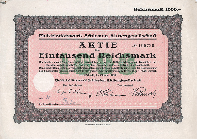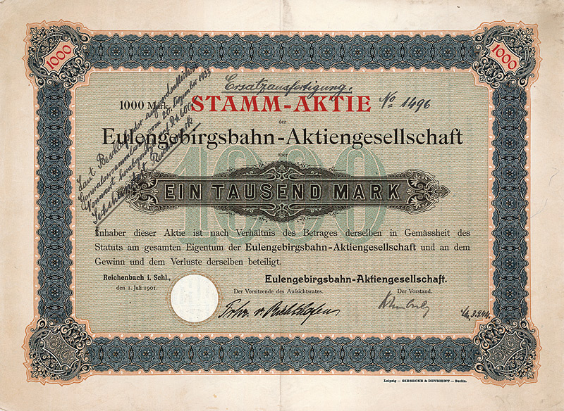 Gründeraktie/Ersatzausfertigung vom 3.9.1944 (R 12). Gründung 1901. Gründer waren u.a. der Staat Preußen und die Kreise Reichenbach, Frankenstein und Neurode. Normalspurige Kleinbahn Reichenbach-Silberberg-Neudorf-Mittelsteine-Wünschelburg (61 km, davon 6 km Zahnradbetrieb). Faksimile-Unterschrift Freiherr von Richthofen, Originalunterschrift des Vorstands von 1944. Handschriftlich Herabsetzung der Aktie auf 600 RM, 1933 beschlossen. Sehr dekorativ. Maße: 26 x 35,3 cm. Mit restlichem Kuponbogen (Kupons jeweils auch als Ersatzausfertigung beschriftet) und mit Lieferbarkeitsbescheinigung. Keine Entwertung. In dieser Form wohl ein Unikat!