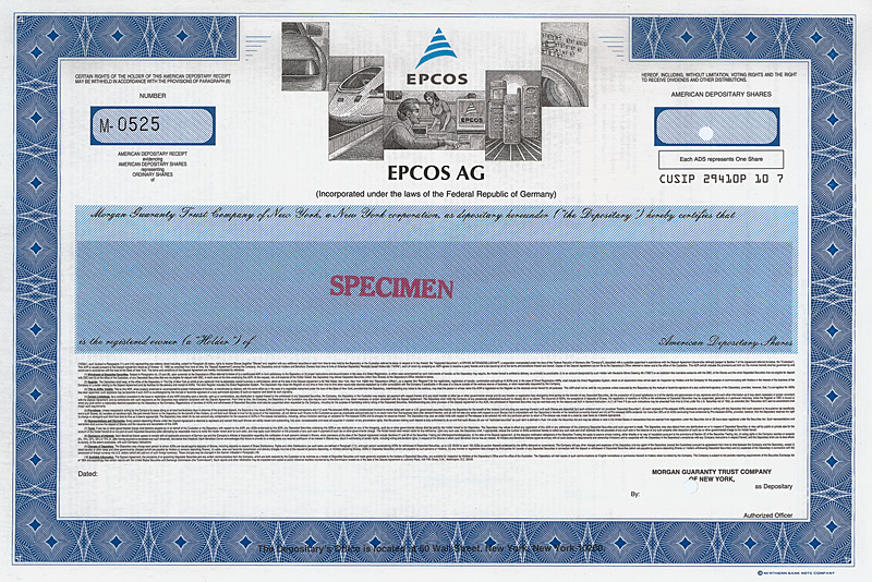 Das Unternehmen ist aus dem 1989 von Siemens und Matsushita gegründeten Joint Venture Siemens Matsushita Components hervorgegangen. Nach dem Börsengang von EPCOS am 15.10.1999 sind Siemens und Matsushita mit einem Anteil von jeweils 12,5 % wichtige Aktionäre geblieben. Die Erstnotierung fand gleichzeitig in Frankfurt und New York statt. EPCOS ist seit März 2003 einer der größten Werte im neu geschaffenen Technologie-Index TecDAX. EPCOS entwickelt, fertigt und vertreibt elektronische Bauelemente mit Fokus auf die technologisch anspruchsvollen Märkte der Informations- und Telekommunikationstechnik sowie der Automobil-, Industrie- und Konsum-Elektronik. Mit rund 13.300 Mitarbeitern wurden im Jahr 2003 1,27 Mrd. Euro Umsatz gemacht. EPCOS ist auf seinem Gebiet in Europa die Nr. 1 und weitweit die Nr. 2. Mit Abb. von Auto, ICE, Handys, Schaltzentrale. Maße: 20,4 x 30,5 cm. Lochentwertet.