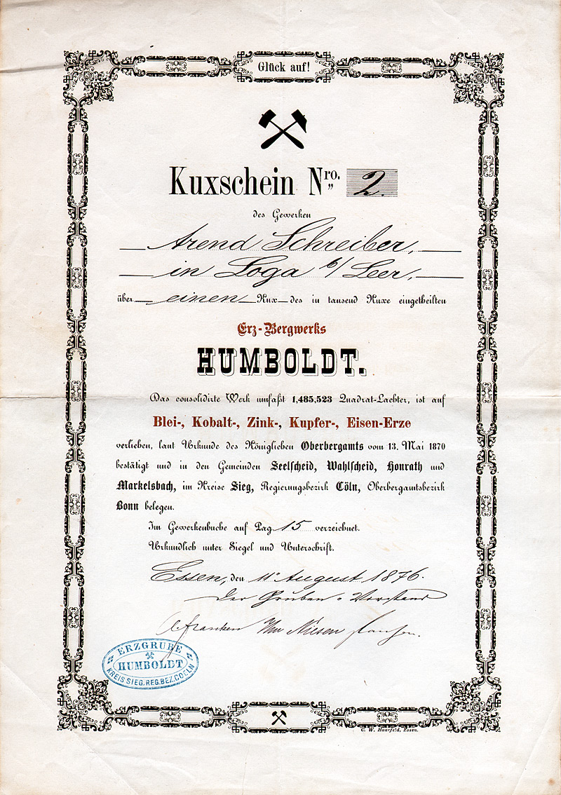 Auflage 1.000 (R 10). Konzessioniert 1870 zum Bergbau auf Blei-, Kobalt-, Zink-, Kupfer- und Eisen-Erze im Gebiet der Gemeinden Seelscheid, Wahlscheid, Honrath und Markelsbach im Kreis Sieg. Die Grube Humboldt war eines von insgesamt 17 Bergwerken, die das vor allem an Blei- und Zinkerzen reiche Bensberger Erzrevier ausbeuteten. Das Grubenfeld der Grube Humboldt war bereits 1851 verliehen worden, und zwar auf Galmei, Blei, Blende, Schwefelkies, Eisen und Braunkohle. Man fand bei der Untersuchung der Lagerstätte eine 22 m tiefe Mulde mit meist steilen Rändern vor, wo man anschließend einen 12 m tiefen Schacht abteufte und nach mehreren Seiten Strecken vortrieb. Alle Spuren des früheren Bergbaus (gelegen in Paffrath im Bereich der heutigen Schmidt-Blegge-Straße) sind durch Einebnen des Geländes und die spätere Bebauung getilgt. Ausgestellt auf den Gewerken Arend Schreiber in Loga b/ Leer. Schön gegliederte Umrandung, mit Originalunterschriften. Maße: 35,5 x 24,8 cm.