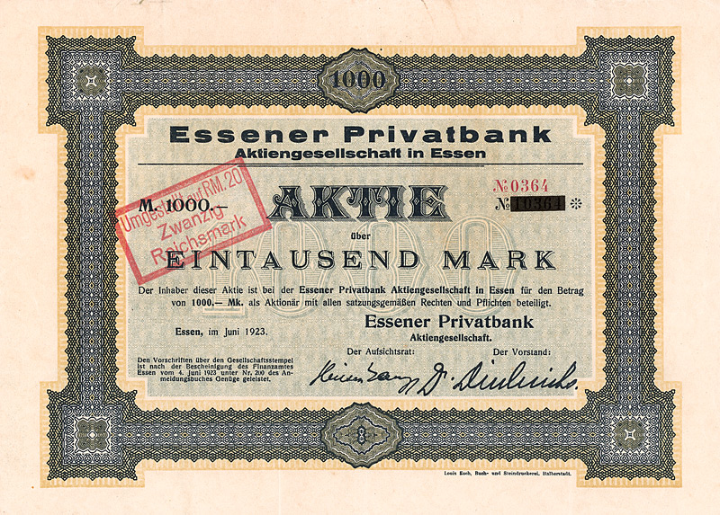 Auflage 75.000, nach Umstellung auf 20 RM nur noch 100 Stück (R 9). Gegründet 1909 als “Rheinisch-Westfälische Landgesellschaft AG”, umfirmiert 1921 in “Bank für Grundbesitz und Handel AG” und 1923 in “Essener Privatbank AG”. Geschäftsansässig Heinickestr. 11. Von den Folgen der Hyper-Inflation, die 1924 eine Kapitalumstellung 375:1 von 75 Mio. auf nur noch o,2 Mio. RM bedingten, erholte sich die Bank nie wieder richtig. 1934 gelöscht. Maße: 19 x 26,3 cm. Nur 7 Stücke wurden Ende 2009 in Privatbesitz gefunden.
