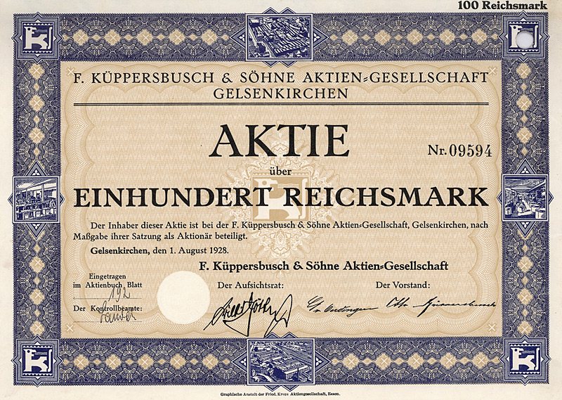 Auflage 5.000, nach teilweisem Umtausch in 1.000-RM-Aktien zuletzt noch 2000. Gründung 1875 als kleine Herdfabrik und Eisengießerei. Schnell stiegen die Umsätze, das Fabrikationsprogramm wurde um Zimmerherde, Gasherde, Großkochanlagen sowie Zentralheizungen und Elektroherde erweitert. Bei Umwandlung in eine AG 1898 wurden in zwei Werken schon 1.200 Mitarbeiter beschäftigt. 1938 Beteiligung an der schon 1722 gegründeten Carl Gottbill sel. Erben GmbH Mariahütte, einer Herdfabrik im Kreis Trier. Neben der Hoesch AG (27 %) gehörte zu der Zeit der Familie Küppersbusch immer noch ein größeres Aktienpaket. 1944 wurde das Werk I in der Fürstinnenstraße bei einem Bombenangriff total zerstört, das Werk II stark beschädigt. Neben dem Wiederaufbau dann 1954 Übernahme der Ver. Herd- und Ofenfabriken C. Woeste AG, Hamm i.W., 1956 war Küppersbusch mit 3500 Beschäftigten die größte Herdfabrik der Welt. Ab 1953 wurden auch Kühlschränke gebaut, ab 1961 Küchenmöbel und Spülen, später zudem Wasch- und Geschirrspülmaschinen. Gleichzeitig baute die AEG ihre Beteiligung immer weiter aus und hielt Mitte der 70er Jahre über 95 % der Aktien. Während des Niedergangs der AEG wurde 1982 auch Küppersbusch zahlungsunfähig. Ab 1986 übernahmen Mitglieder der Familie Vaillant fast alle Aktien des bis heute erfolgreichen Herstellers von Wärmetechnik, Hausgeräten und Großküchentechnik. Vier Vignetten mit Innen- und Außenansichten des Werkes, Firmensignet in allen vier Ecken. Lochentwertet. Maße: 21 x 29,6 cm. |