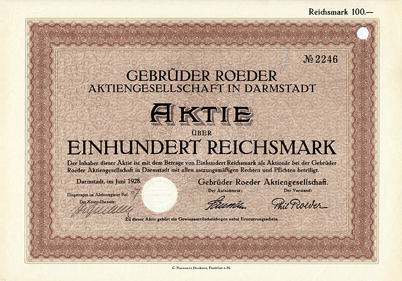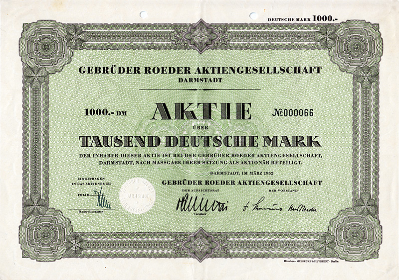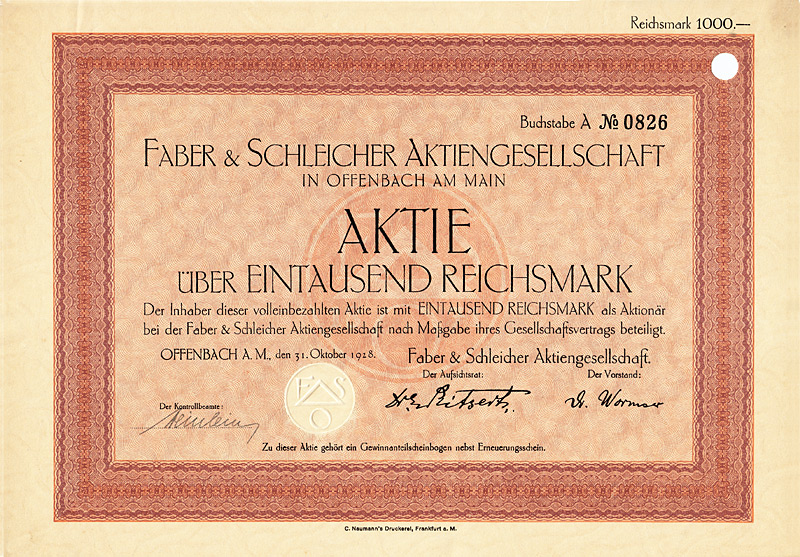 Auflage 200 (R 10). Gründung 1871 als “Associationsgeschäft zur Produktion von lithographischen Schnellpressen” durch Louis Faber und Adolf Schleicher. AG seit 1897 als “Faber & Schleicher Maschinenfabrik auf Actien”. Zunächst Bau von Steindruck-Schnellpressen, 1911 kommt die erste ROLAND-Offsetpresse auf den Markt. 1957 Umfirmierung in “Roland Offsetmaschinenfabrik Faber & Schleicher AG”. 1979 Vereinigung mit dem Druckmaschinenbereich der M.A.N. und Umfirmierung in “MAN Roland Druckmaschinen AG” zum weltweit zweitgrößten Hersteller von Druckmaschinen und Weltmarktführer im Rollenoffset. Beschäftigt waren 8.700 Mitarbeiter in den Werken Augsburg, Offenbach, Plauen und Mainhausen. 2005/06 squeeze-out der Kleinaktionäre der bis dahin börsennotierten AG, später verkauft MAN die Mehrheit an den Investor “Allianz Capital Partners GmbH”. Unter der Krise im Druckmaschinenmarkt brach das Unternehmen Ende 2011 zusammen und wurde zerschlagen; nachdem Interessenten nicht gerade Schlange standen, verkaufte der Insolvenzverwalter die Werkstandorte einzeln. Lochentwertet. Maße: 21 x 29,7 cm. Nur 5 Stücke sind bis heute erhalten geblieben!