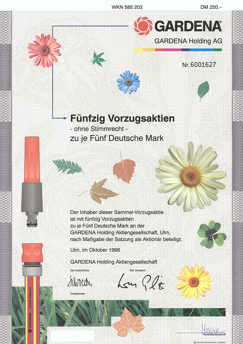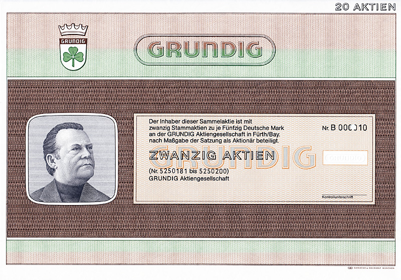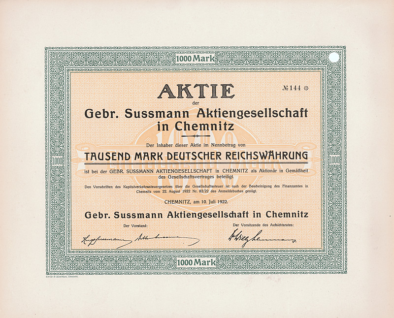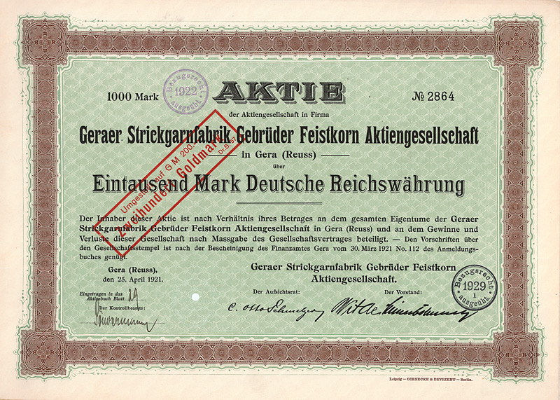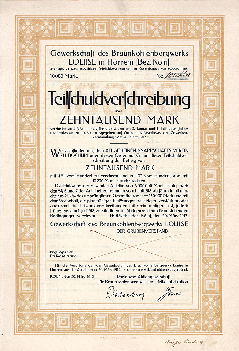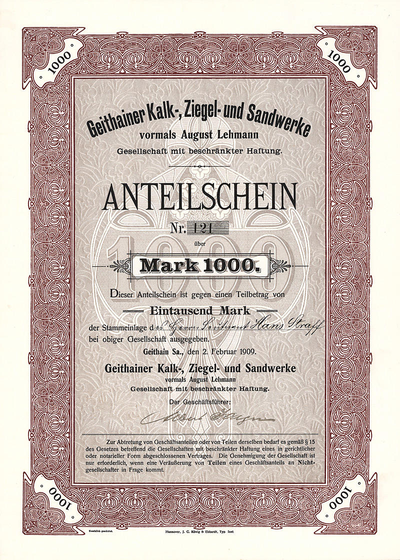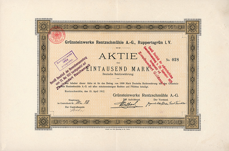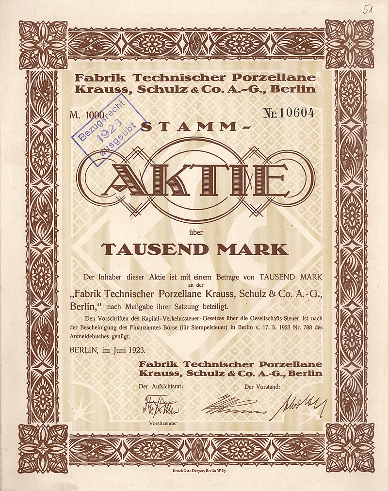 Auflage 15.000 (R 10). Gründung 1922 zwecks Übernahme bestehender Fabriken in Berlin-Halensee (Eisenzahnstr. 47/48), außerdem Erwerb der Porzellanfabrik Groh & Co. in Selb (Bayern). 1925 wurde die Gesellschaft aufgelöst. Maße: 29,5 x 23 cm. Mit kpl. Kuponbogen. Nicht entwertetes Stück, sehr günstig angeboten!