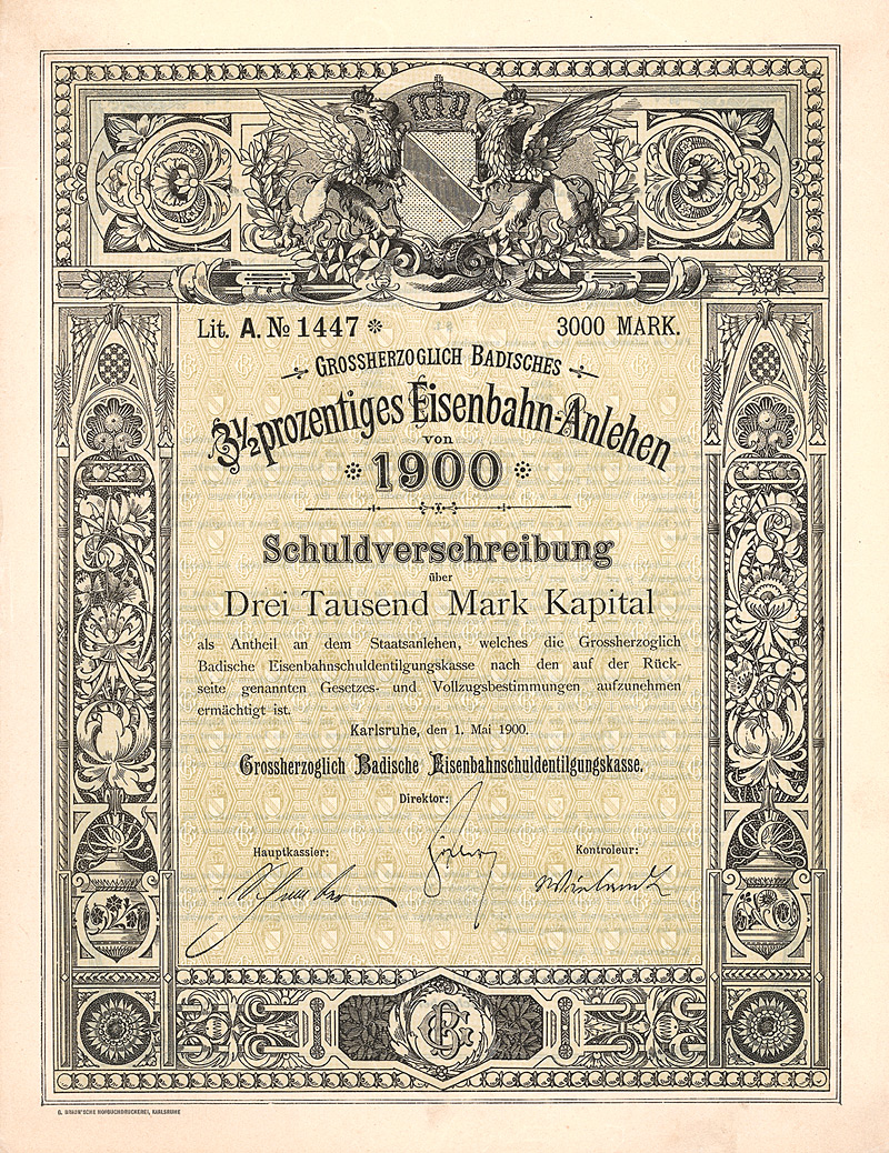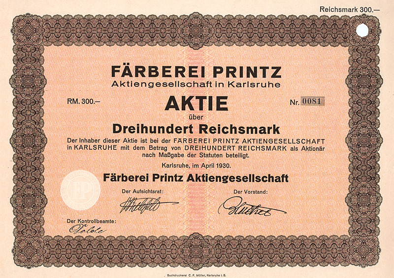 Auflage 1.500. Gründung als AG 1898 in der Ettlinger Straße zum Betrieb einer Färberei und chemischen Waschanstalt mit zahlreichen Filialen. Eduard Printz (1821-1892) gründete 1846 eine Schön- und Seidenfärberei und durfte sich nach einem Großauftrag Hof-Schönfärbermeister nennen. Daraus entwickelte sich 1869 unter seinem Sohn Theodor das Unternehmen der Kunstwäscherei und Chemisch-Reinigung Printz, das Ende des 20. Jh. von dem Ettlinger Reinigungsunternehmen Carl Bardusch, heute Bardusch GmbH & Co., übernommen und dort unter altem Namen fortgeführt wurde. Lochentwertet. Maße: 21 x 29,7 cm.