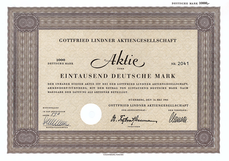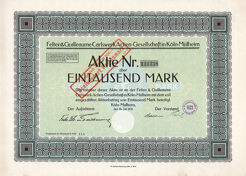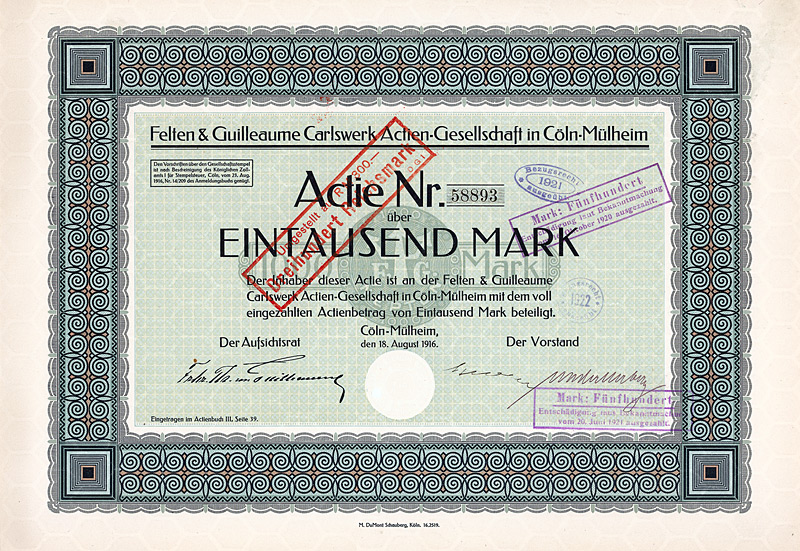 Auflage 5.000. Ursprüngliche Gründung 1826 in Köln als Hanfseilerei. 1873 wurde für die Herstellung von Draht, Drahtseilen und Kabeln in Mülheim am Rhein eine Niederlassung errichtet. Dieses Zweigwerk wurde 1899 in einer AG verselbständigt. 1905 Angliederung der Frankfurter Maschinenfabrik der “Elektrizitäts-AG vorm. W. Lahmeyer & Co.” und zwischenzeitliche Umfirmierung in “Felten & Guilleaume-Lahmeyerwerke AG”. Bereits 1910 wurde dieses Werk wieder abgestoßen und die alte Firmenbezeichnung wieder angenommen. Großaktionär war lange Zeit der Luxemburger Arbed-Konzern. 1979 erwarb der Philips-Konzern die Mehrheit und firmierte das Unternehmen in PKI Philips Kommunikations Industrie AG um. Unter dem alten Namen wurde für das ursprüngliche Geschäft die Felten & Guilleaume Energietechnik AG 1986 aus der PKI herausgelöst und an die Börse gebracht. Wichtiger Industrie-Wert. Sehr dekorativ gestaltetes, großformatiges Papier. Maße: 26,5 x 37,8 cm. Prägesiegel lochentwertet.
