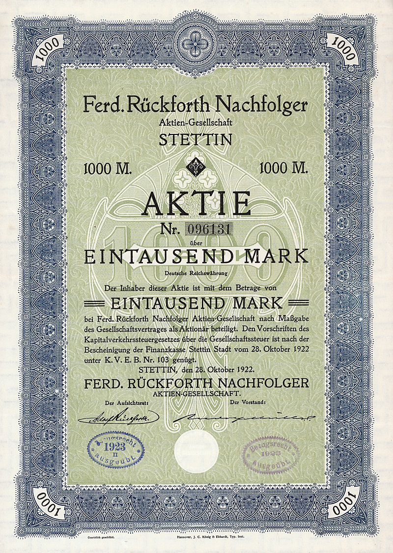 Auflage 20.000 (R 10). Bereits 1742 als oHG errichtet, 1912 in eine AG umgewandelt. Ursprünglich nur eine Likörfabrik, erlebte das Unternehmen schließlich eines der schillerndsten Schicksale der jüngeren Wirtschaftsgeschichte. Erzeugt wurden im Werk Stettin-Oberwieck Liköre, Weinbrände, Rum, Arrak, Branntweine und Fruchtsäfte. Außerdem war Rückforth Großaktionär aller drei Regionalbrauereien in Stettin sowie bei sieben weiteren Brauereien in Ostpreußen und Schlesien. Börsennotiz Berlin, Frankfurt a.M. und Stettin. 1945 ging fast der gesamte Fabrik- und Beteiligungsbesitz im Osten verloren. 1947 Sitzverlegung von Stettin nach Uslar/Hann. und weiter 1950 nach Siegburg (Rhld.), wo in eigenen Räumen die Weinbrennerei und Likörfabrikation wieder aufgenommen wurde. 1970/78 wurde das angestammte Geschäft ganz aufgegeben. Ab 1980, nach der Sitzverlegung nach Heidelberg, begann eine zunächst glanzvolle und von der Wirtschaftspresse bejubelte zweite Karriere im Bauträgergeschäft, die dann aber 1985 im Konkurs endete. Großes Hochformat, mit schönen Jugendstil-Elementen im Unterdruck. Maße: 37 x 26,4 cm. Mit Kuponbogen. Nach der Inflation wurde 1925 das Kapital 100:1 umgestellt. Vorliegende Aktie wurde dabei offenbar vergessen. Von dieser Rarität sind nur drei Stücke bekannt!
