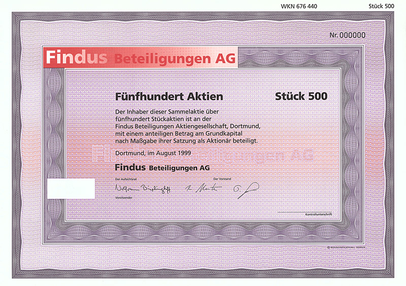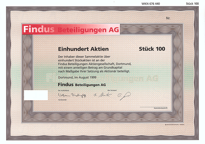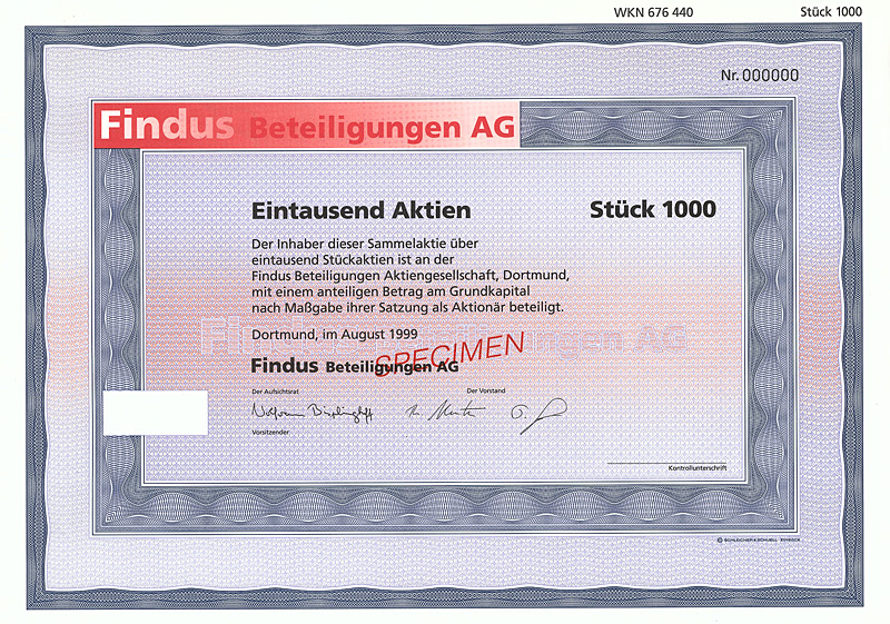 Nullgeziffertes Specimen (R 9).Gründung 1994 als New Tigerland Beteiligungen AG, 1998 Umfirmierung wie oben. Die Ges. (mit den Großaktionären AHAG Wertpapierhandelsbank AG und Börsenmakler Schnigge AG) war an 13 New-Economy-Firmen beteiligt (u.a. an der PSI AG für Produkte und Systeme der Informationstechnologie in Berlin, der PRO/motion Medien & Management AG in Langenfeld, der DONE Project AG in Wietmarschen, der CyberRadio AG in Hannover und der skandalumwitterten met@box AG in Hildesheim). Eine Schicksalsgemeinschaft: Mit der New Economy ging auch Findus unter. Im Gegensatz zu den anderen Gesellschaften wurde das Unternehmen jedoch saniert und ist heute operativ wieder tätig. Maße: 21 x 29,7 cm. Mit Kuponbogen. Nur 10 Stücke wurden in dieser Form gedruckt, der Einlieferer erhielt sie in der noch ungeöffneten Originalverpackung der Wertpapierdruckerei.