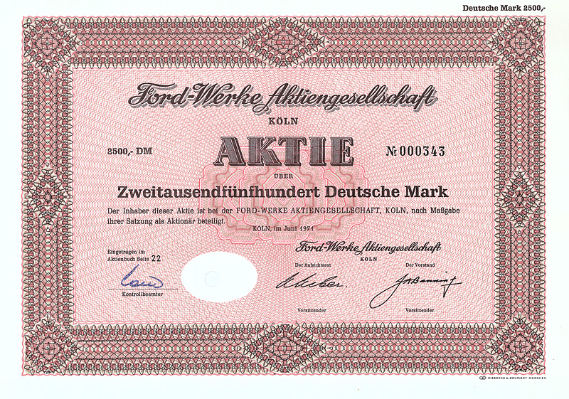 Auflage 239.000. Henry Ford baute 1896 sein erstes Automobil. 1903 gründete er in Detroit die Ford Motor Company. In den 20er Jahren besaß Ford in den USA einen Marktanteil von 50 % und expandierte kräftig in’s Ausland: 1925 wurde in Berlin die Ford Motor Company AG gegründet. Die Fabrik in Berlin-Plötzensee war zunächst ein reines Montagewerk. 1931 ging das noch heute bestehende Werk in Köln in Betrieb, dessen Grundstein Henry Ford persönlich gelegt hatte. 1939 wurde der heutige Firmenname angenommen: Ford-Werke AG. Nennenswerte Kriegsschäden (wen wundert’s?) erlitten ausgerechnet die Ford-Werke natürlich nicht, so daß bereits am 8.5.1945 die Produktion wieder aufgenommen werden konnte. Schon 1953 wurden vor allem dank des legendären Taunus 12 M alle früheren Produktionsrekorde eingestellt. Bis zum Squeeze-Out 2002 in Deutschland auch börsennotiert. Maße: 21 x 29,8 cm. Prägesiegel lochentwertet.