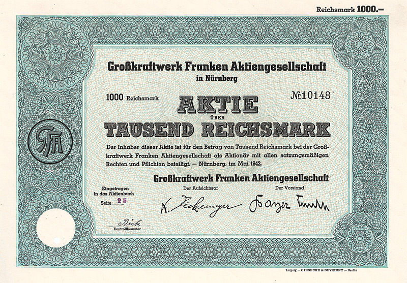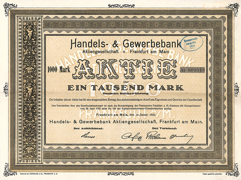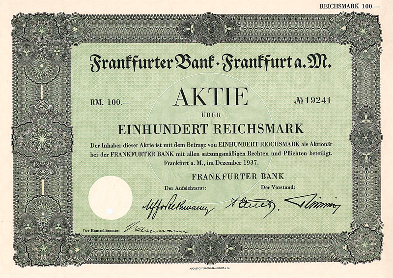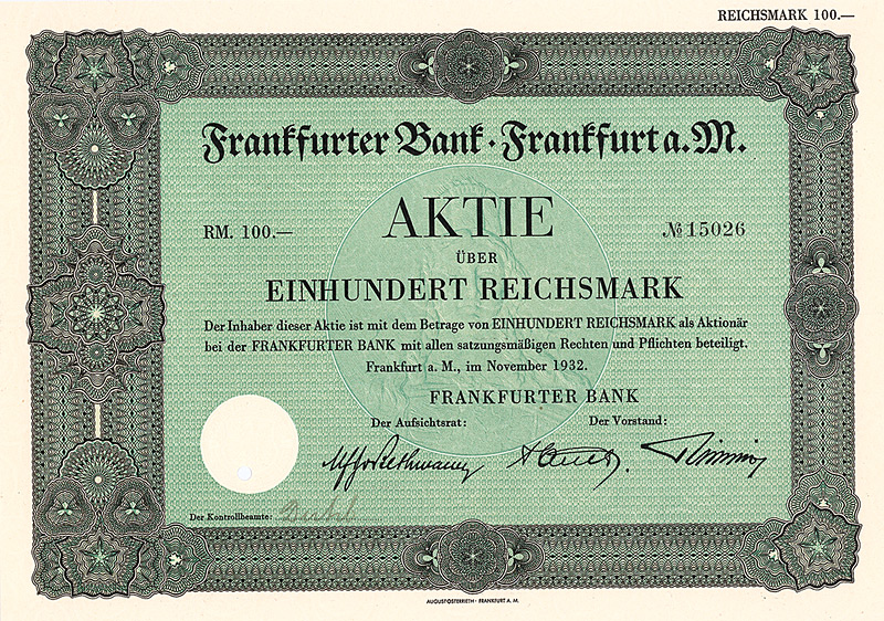 Auflage 1.000 (R 9). Die Gründung der Frankfurter Bank erfolgte 1854. Zu den Gründern zählten die Bankhäuser Gebrüder Bethmann, Grunelius & Co., Rothschild & Söhne sowie die Frankfurter Vereinskasse. Die Konzession wurde vom Rat der Stadt Frankfurt auf Antrag der oben erwähnten Gründer erteilt. Das “Provisorische Bank-Comite”, das allen Frankfurter Bürgern die Möglichkeit zur Beteiligung geben wollte, wurde vom Erfolg des Zeichnungsaufrufes im Jahr 1854 völlig überrascht: Der Andrang war so groß, daß die Münzgasse am Sitz der Bank vom Militär gesperrt werden mußte. Zeichnungswillige aus Sachsenhausen brachten das für die 5%ige Kaution erforderliche Silbergeld gleich auf Schubkarren über den Main. Zum Schluß war bei 9.531 Anmeldungen das ohnehin sehr hohe Gründungskapital (10 Millionen Gulden) noch um das 16fache überzeichnet (Zu dieser Zeit hatte Frankfurt gerade 80.000 Einwohner!). Im Aufsichtsrat waren mit von Grunelius, von Metzler, Hauck, von Bethmann, Oppenheimer u.a. alle großen Namen der Frankfurter Finanzwelt vertreten. Die Frankfurter Bank als Privatnotenbank belebte nicht nur den Notenumlauf vor allem im süddeutschen Raum, sie übernahm auch für die nahezu 100 Privatbanken der Stadt eine Art Zentralbankfunktion. 1871 war sie bereits die drittgrößte deutsche Bank. Durch die Gründung der Deutschen Reichsbank, die durch das Bankgesetz vom 14.3.1875 geschaffen wurde, war die ursprüngliche Funktion als private Notenbank ab diesem Zeitpunkt erheblich eingeschränkt. Es durften nur noch 100 Mark-Banknoten ausgegeben werden. Weitere Einschränkungen der Notenemission durch die Reichsbank veranlaßten die Frankfurter Bank, im Jahr 1901 ihr Notenprivileg aufzugeben. Die seit 1876 umlaufenden Frankfurter Geldnoten wurden zum 31.12.1901 eingezogen. Statt dessen wurde der Frankfurter Bank vom preußischen Staat aber das Privileg der Mündelsicherheit verliehen, welches bis zum Ende des 2. Weltkrieges die Basis ihrer Geschäftstätigkeit bildete. Somit wurde aus der Notenbank eine Vermögensverwaltungsbank mit Depot- und Effektengeschäften. Auch im Tages- und Termingeldhandel zwischen den Kreditinstituten war die Bank tätig, nicht jedoch im Kreditgeschäft mit der Industrie. Das kam der Frankfurter Bank in der Weltwirtschaftskrise zugute, da sie von den Problemen in Zahlungsnot geratener Betriebe nicht betroffen war. Nach der Währungsreform 1948 unter der Leitung von Hermann Jannsen richtete sich die Bank neu aus und wandelte sich zur überregionalen Kreditbank. 1962 eröffnete die Bank erstmalig in ihrer Geschichte auch Zweigniederlassungen. 1970 erfolgte die Fusion mit der “Berliner Handelsgesellschaft” zur BHF-Bank, das war bis dahin der größte Bankenzusammenschluß der deutschen Nachkriegsgeschichte. 1998/99 Übernahme durch die niederländische ING-Gruppe. 2005 Übernahme durch Sal. Oppenheim und Weiterführung als “BHF-Bank - Privat seit 1854”. Seit Sal. Oppenheim 2010 von der Deutschen Bank aufgefangen wurde sucht der neue Eigentümer für die BHF-Bank schon wieder einen Käufer. Maße: 21 x 29,7 cm. Prägesiegel lochentwertet.
