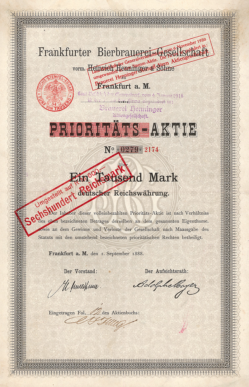 Auflage 1.000 (R 8). Gründung 1881 unter Übernahme der seit 1869 bestehenden Henninger’schen Brauerei in Sachsenhausen. Wegen Kapitalzusammenlegung 1888 Neuausgabe der Aktienurkunden. 1920 nach Fusion Umfirmierung in Brauerei Henninger-Kempff-Stern AG, seit 1935 Henninger-Bräu AG. Weiter übernommen wurden die Cerveceria Bieckert S.A. in Buenos Aires (1958), die Cerveceria Schneider S.A. im argentinischen Santa Fé (1959), die Brauhaus Nürnberg J. G. Reif AG (1960), die Kreuznacher Brauhaus Ph. Nicolay KG (1961), die Union-Brauerei in Groß-Gerau und die Engelbräu Heidelberg (1966), die Aktienbrauerei-Bürgerbräu AG in Ludwigshafen (1968), die Eichbaum-Werger-Brauereien AG in Worms (1970) und die Germania-Brauerei AG in Wiesbaden (1972 von Binding). Mit einem Jahresausstoß von über 2 Mio. hl die größte Braustätte Deutschlands. Älteste verfügbare Henninger-Bräu-Aktie. Maße: 32,8 x 21,4 cm. Nicht entwertet!