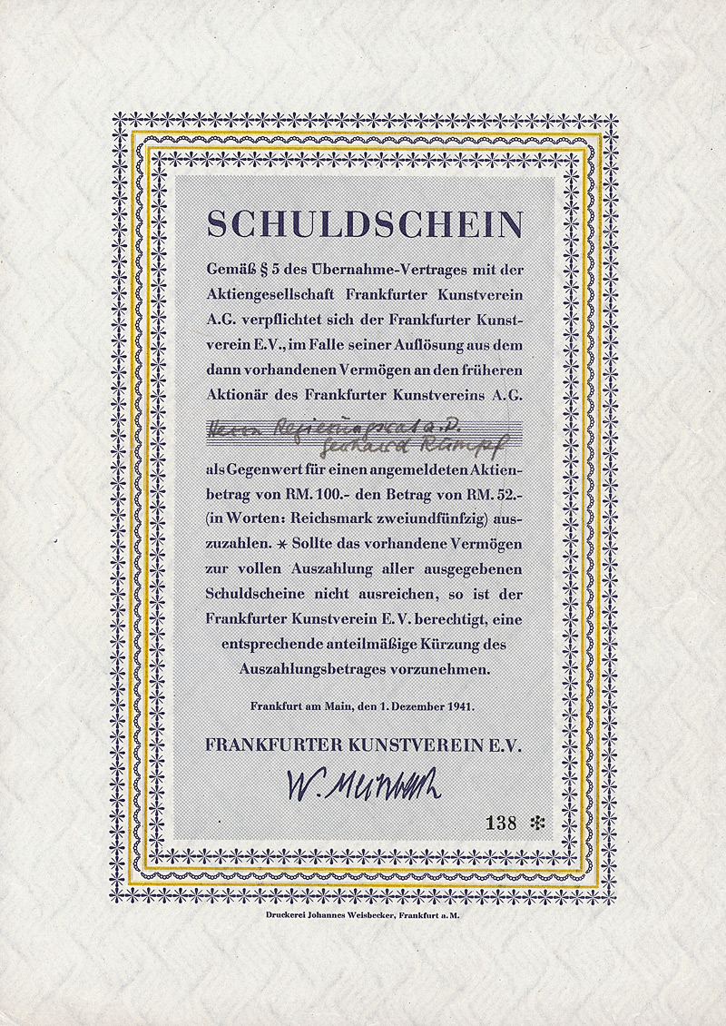 (R 7) Gründung 1855. Zweck: Förderung der Kunst mittels Ausstellung, An- und Verkauf sowie Verlosung von Kunstgegenständen. Der Kunstverein trat die Nachfolge seines 1829 gegründeten gleichnamigen Vorgängers an, dessen desolate Finanzlage eine Neuorganisation erforderte. Besonders erwähnenswert ist das Mitte des letzten Jahrhunderts durchgeführte Kaisersaalprojekt: 17 Künstler schufen im Auftrag des Kunstvereins 22 Kaiserbilder in den gotischen Wandnischen des Kaisersaals im Römer. Auch das Goethe-Denkmal wurde mit Spenden des Kunstvereins finanziert. Mit 3.000 Mitgliedern hatte der Verein schon kurz nach der Gründung bereits genausoviele Mitglieder wie auch heute noch. 1861 wurde das erste eigene Ausstellungsgebäude in der Junghofstraße eröffnet. Spitzweg, Liebermann, Beckmann, Slevogt, Kandinsky, Nolde und viele andere Künstler stellten dort aus. Dieses Gebäude wurde 1944 bei einem Bombenangriff völlig zerstört. Seit 1962 ist das Steinerne Haus am Römerberg Sitz des Kunstvereins. Ausgegeben anläßlich der Umwandlung des 1855 als Aktiengesellschaft gegründeten Kunstvereins in einen eingetragenen Verein. Maße: 29,6 x 21,1 cm