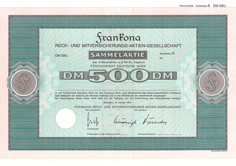 (R 10) Gründung 1886 als “Badische Rück- und Mitversicherungs-Gesellschaft” mit Sitz in Mannheim. 1907 Sitzverlegung nach Frankfurt a.M. und Umbenennung in Frankona Rück- und Mitversicherungs-AG. 1915 Sitzverlegung nach Berlin, 1948 nach Heidelberg und 1957 nach München. 1977 Änderung des Namens in Frankona Rückversicherungs-AG. 1995 Verkauf der Aktienmehrheit (rund 55%) an die amerikanische GE Employers Re, die dann mit Hilfe von Umstrukturierungen einen Sqeeze-out vornahm, der erst 2007 endgültig abgeschlossen wurde. Nachdem die GE-Gruppe von der Schweizerischen Rückversicherungsgesellschaft übernommen worden ist, nun Swiss Re Frankona Rückversicherungs-AG. Maße: 21 x 29,7 cm. Rückseitig als ungültig abgestempelt.