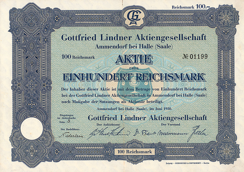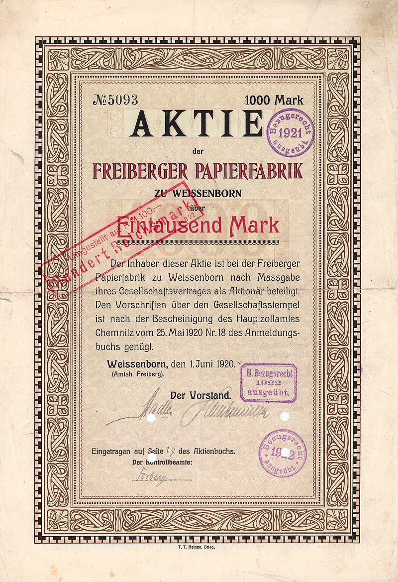 Auflage 1.650 (R 9). Gründung 1871. Herstellung und Vetrieb von Papier, Zellstoff, Strohstoff und Sulfitspiritus. 1942 Organvertrag mit dem Großaktionär Aschaffenburger Zellstoffwerke AG, Berlin. 1947 enteignet und als volkseigener Zweigbetrieb der Industrie-Verwaltung Zellstoff und Papier weitergeführt. Herrliche Umrandung. Maße: 35,1 x 24,1 cm. Lochentwertet.
