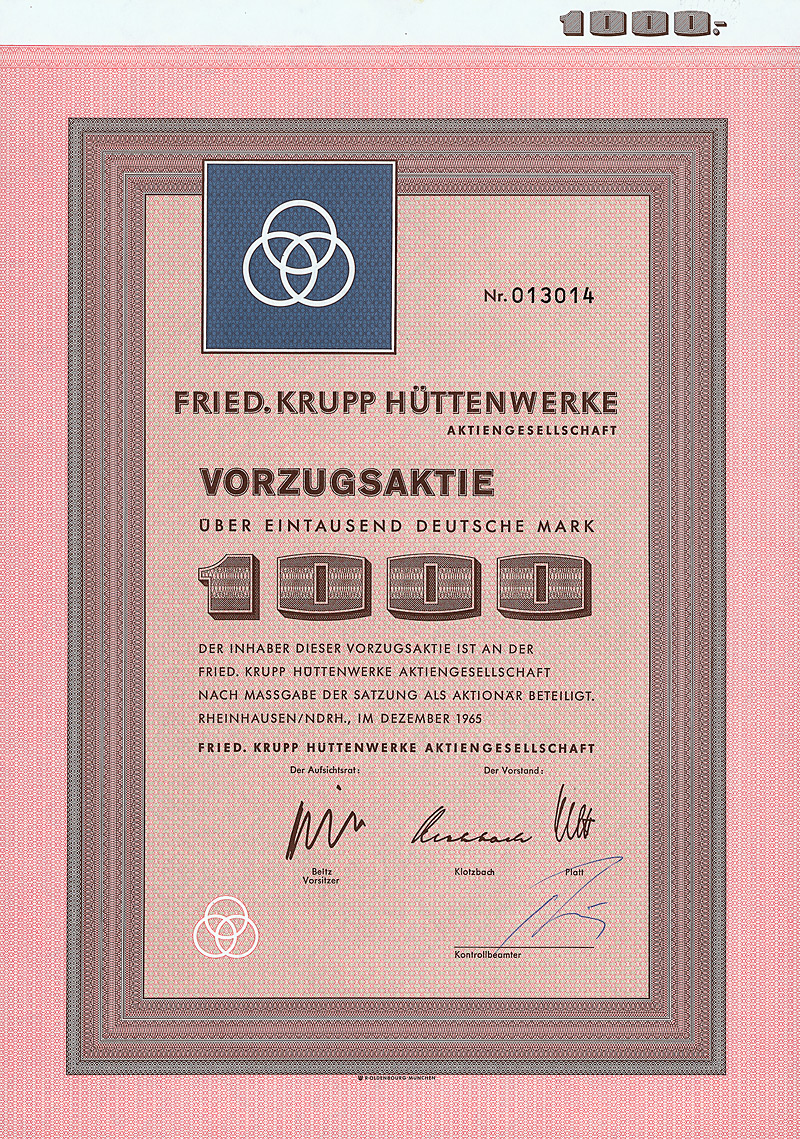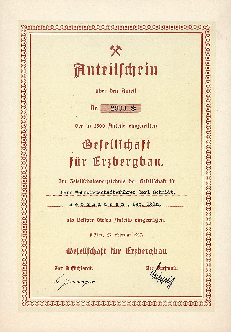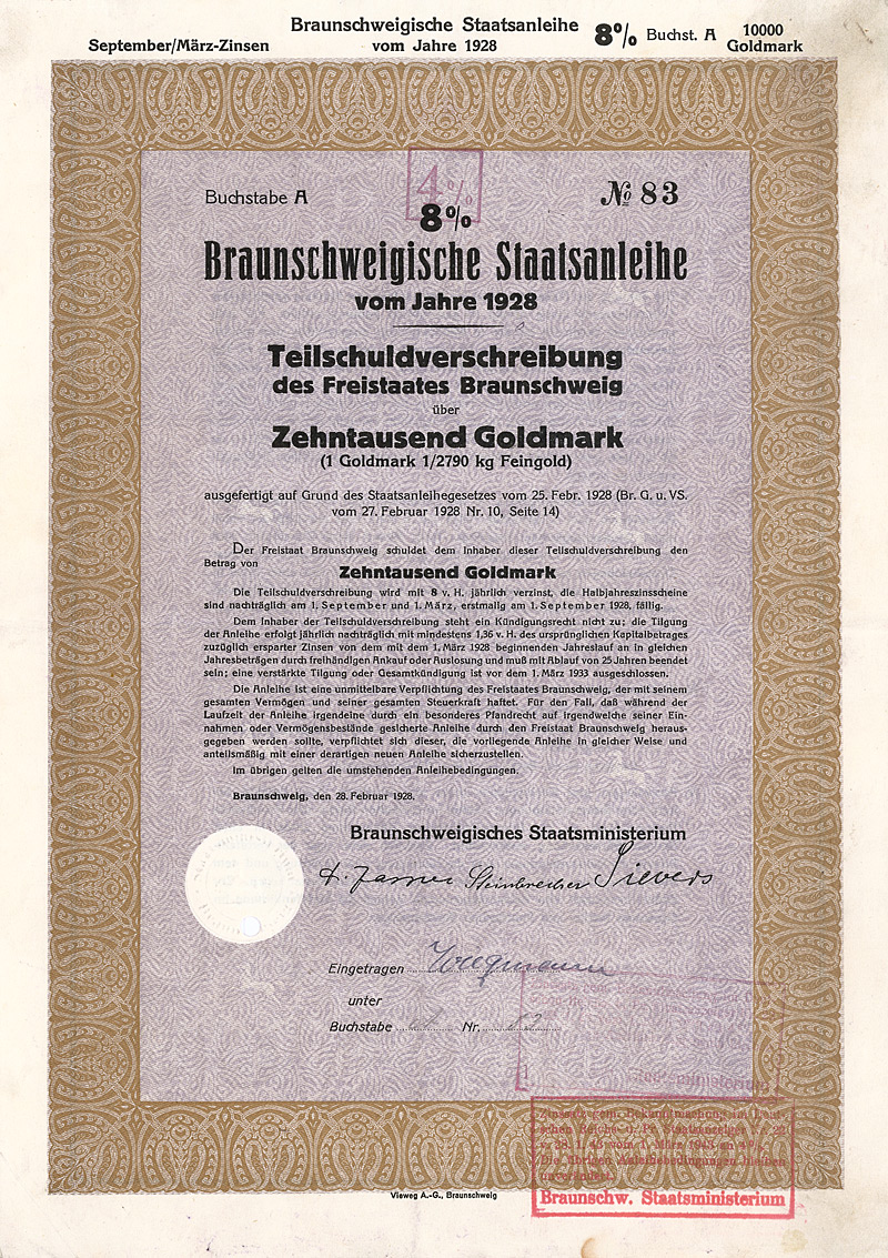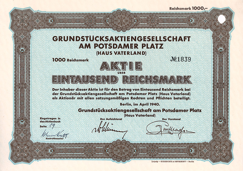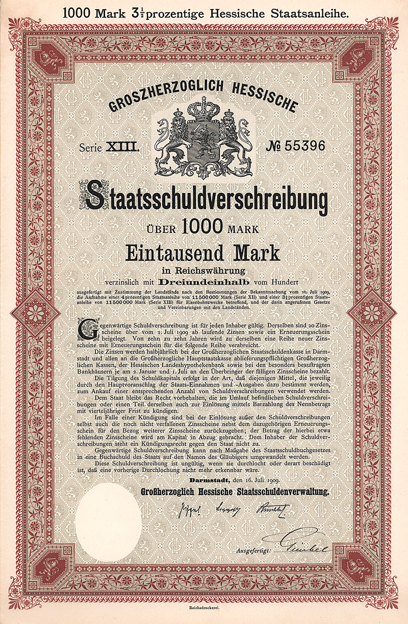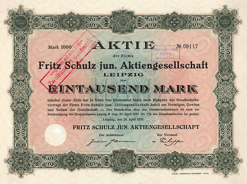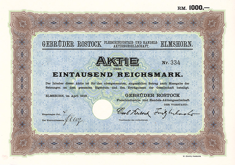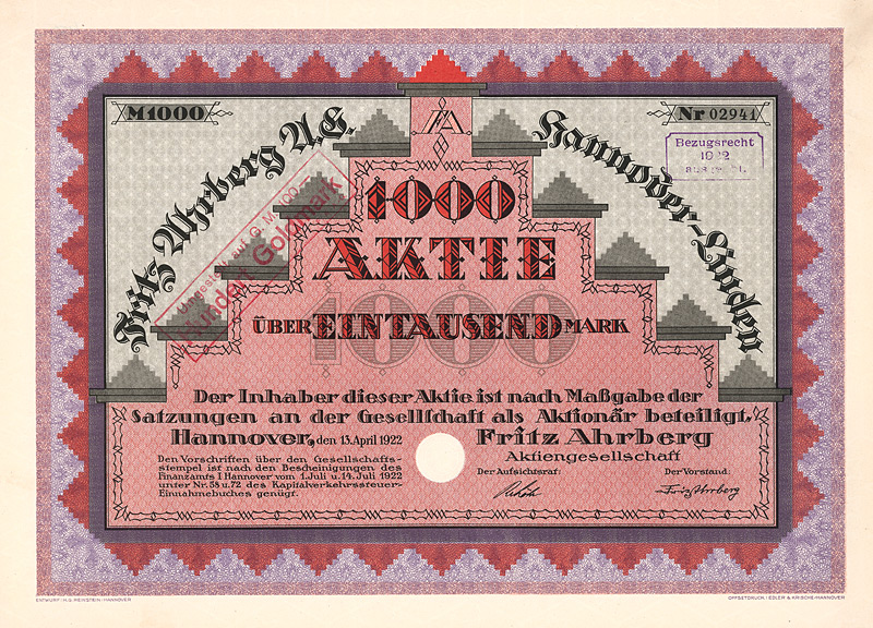 Auflage 2.000 (R 6). Hochformat mit schöner Umrahmung. Mit Faksimile-Unterschrift des Bankiers Münchmeyer. Maße: 37,6 x 26,5 cm. Doppelblatt, inwendig und rückseitig mehrere Übertragungsvorgänge bis 1941. Nicht entwertetes Stück in einem sehr guten Erhaltungszustand.
