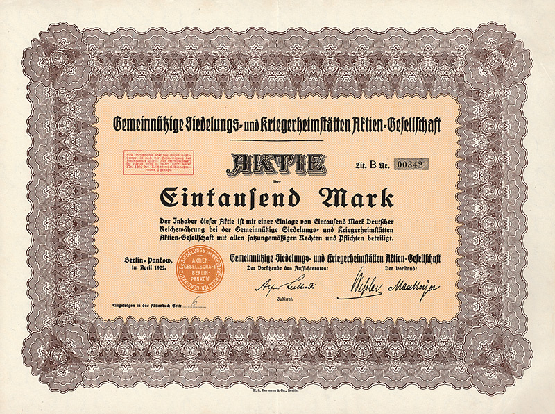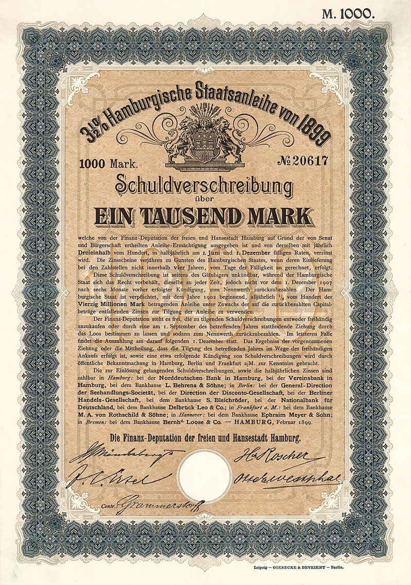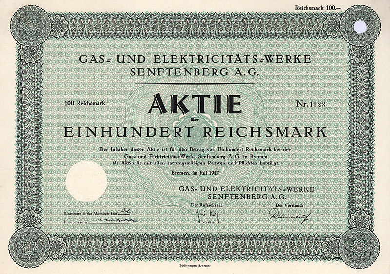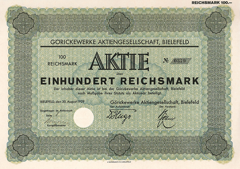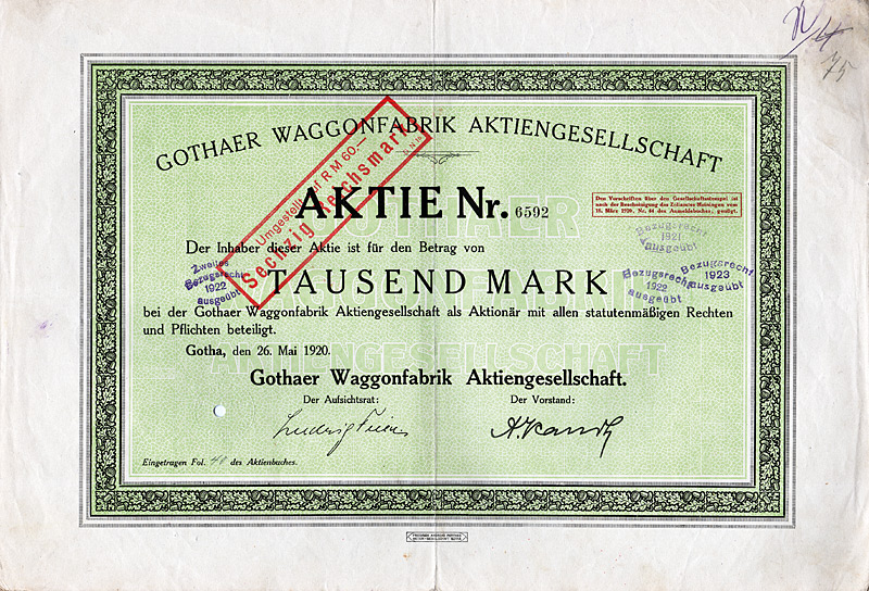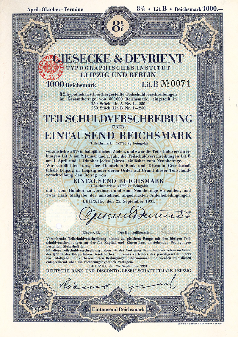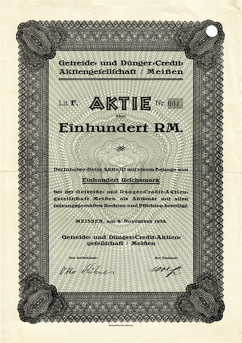 Auflage 2.000 (R 6). Hochformat mit schöner Umrahmung. Mit Faksimile-Unterschrift des Bankiers Münchmeyer. Maße: 37,6 x 26,5 cm. Doppelblatt, inwendig und rückseitig mehrere Übertragungsvorgänge bis 1941. Nicht entwertetes Stück in einem sehr guten Erhaltungszustand.