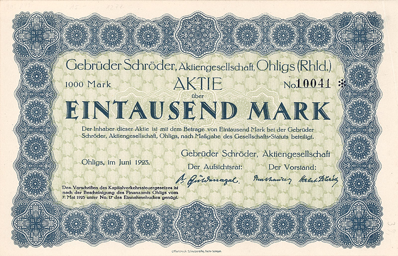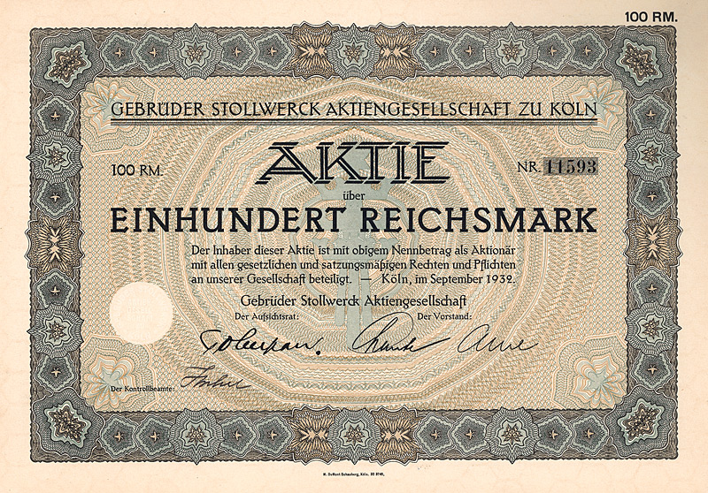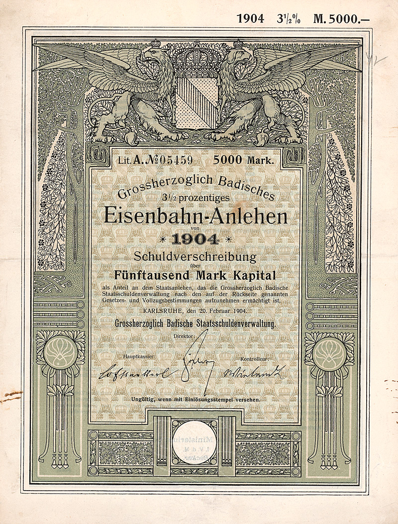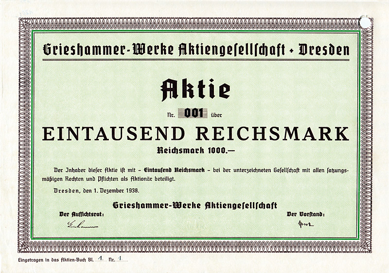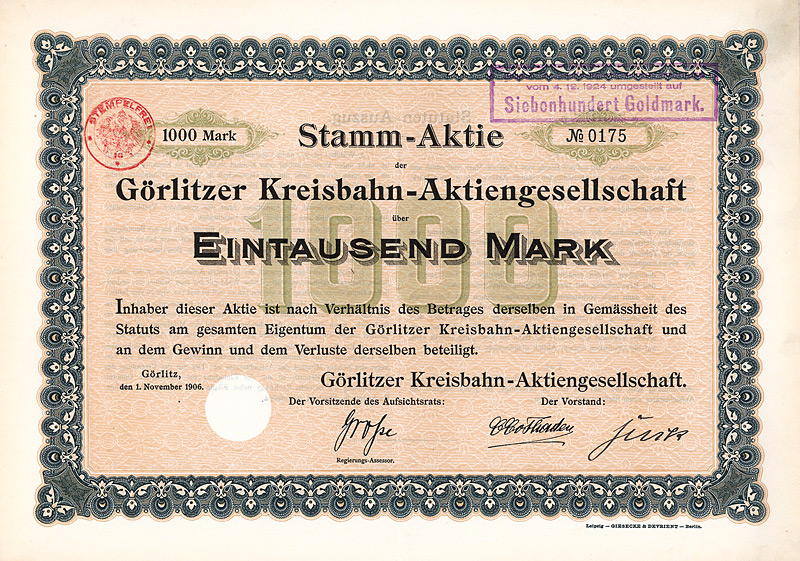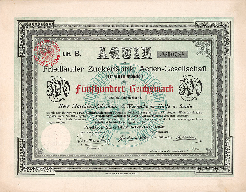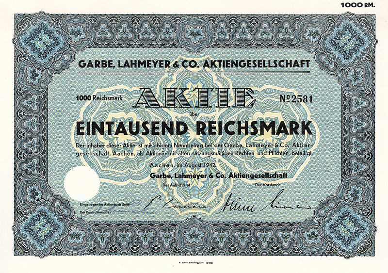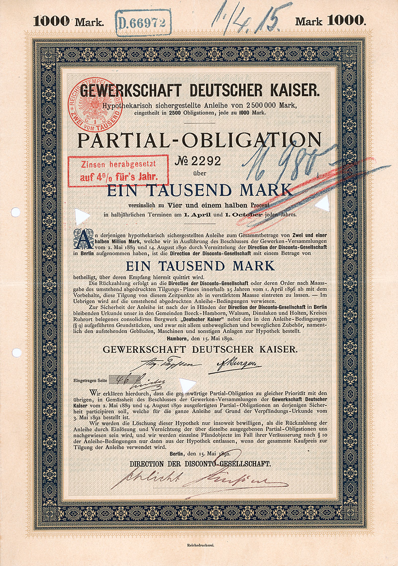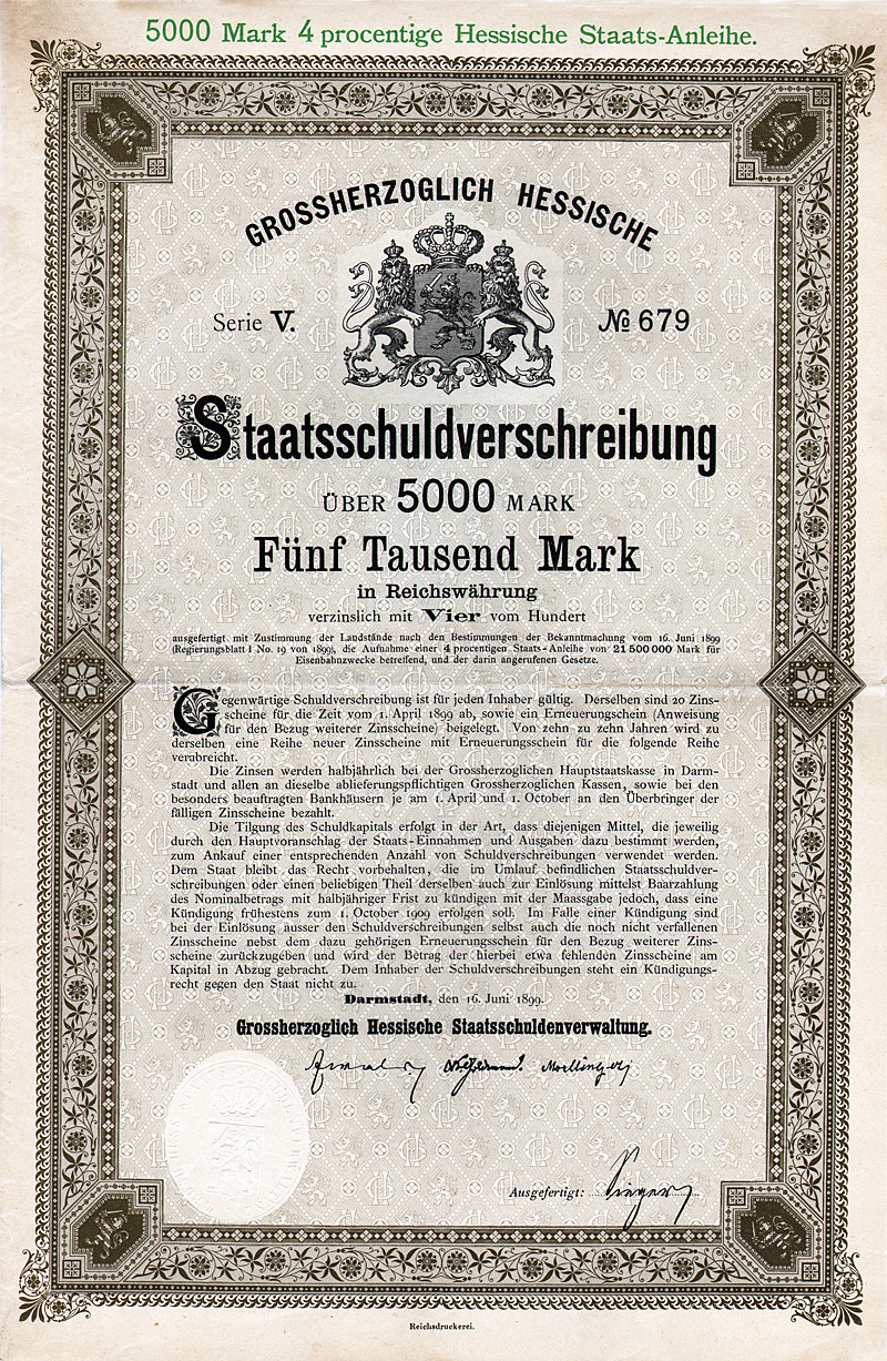 Auflage 2.000 (R 6). Hochformat mit schöner Umrahmung. Mit Faksimile-Unterschrift des Bankiers Münchmeyer. Maße: 37,6 x 26,5 cm. Doppelblatt, inwendig und rückseitig mehrere Übertragungsvorgänge bis 1941. Nicht entwertetes Stück in einem sehr guten Erhaltungszustand.