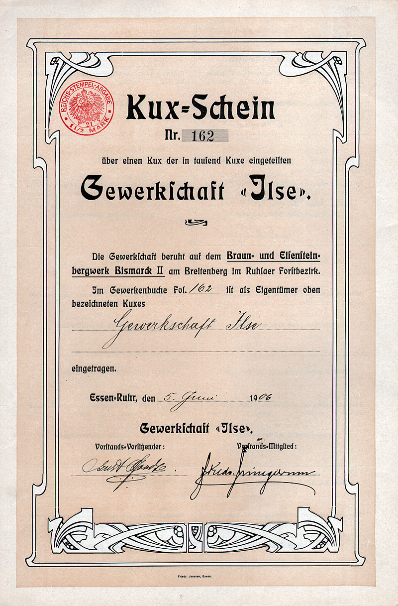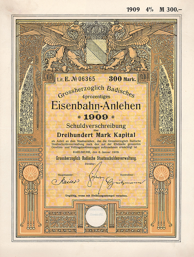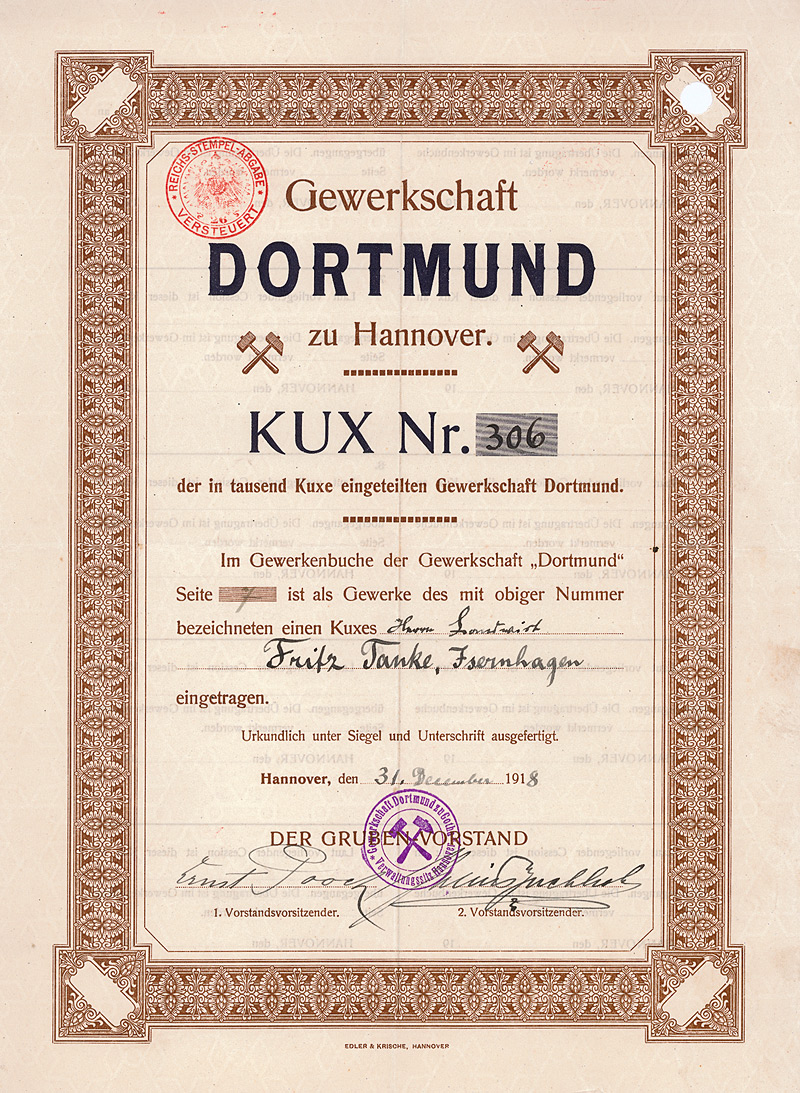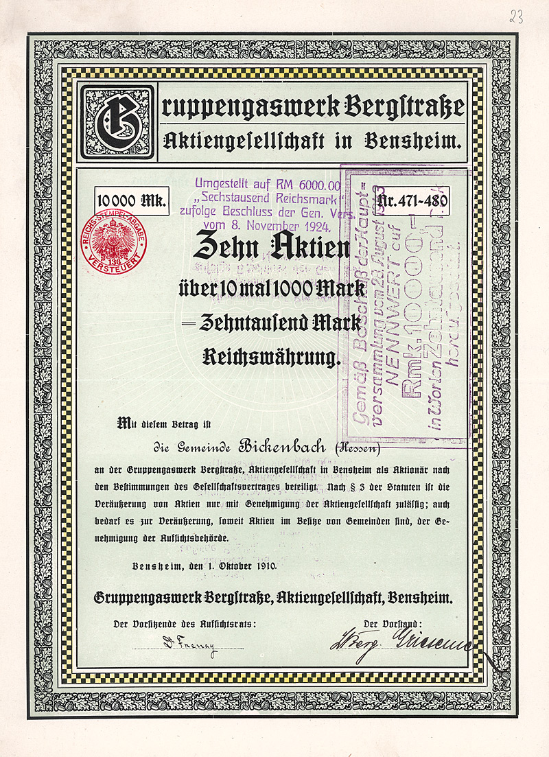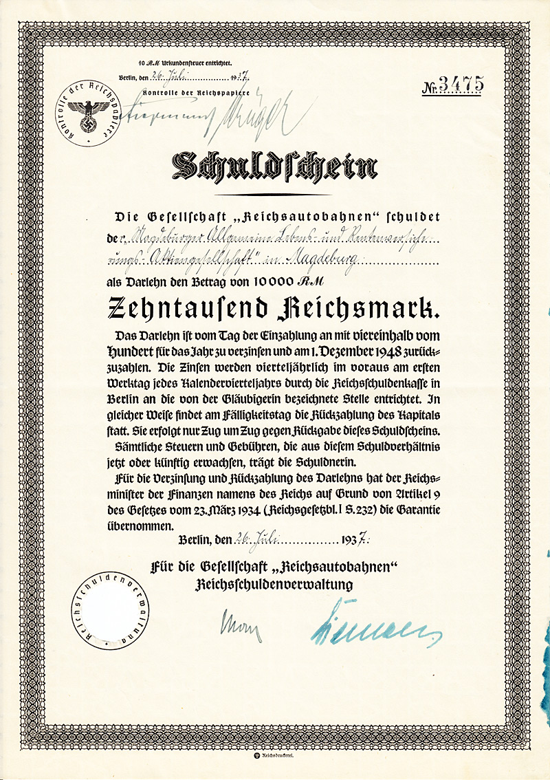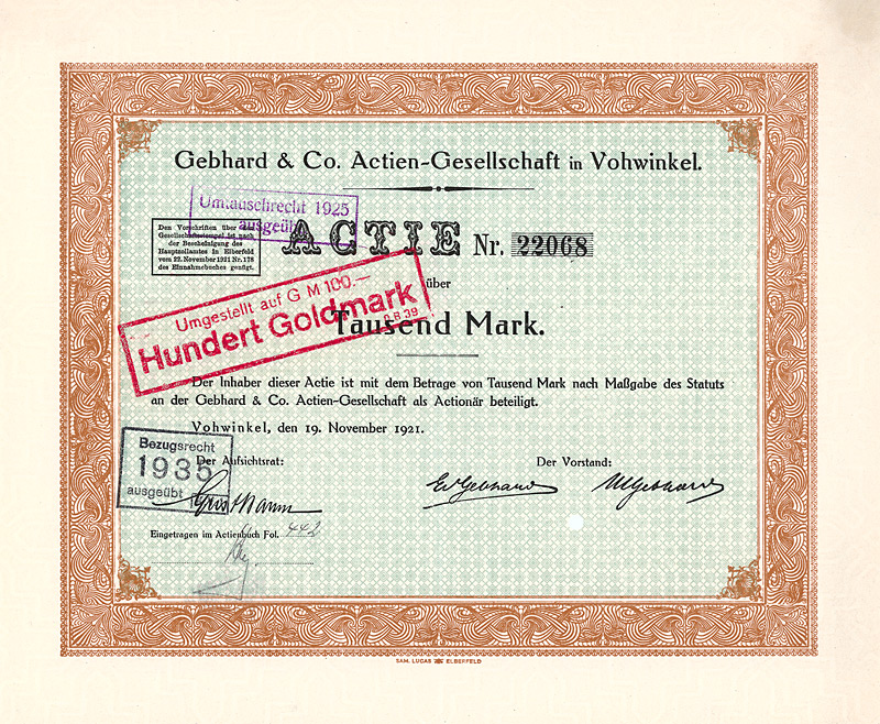 Auflage 2.000 (R 6). Hochformat mit schöner Umrahmung. Mit Faksimile-Unterschrift des Bankiers Münchmeyer. Maße: 37,6 x 26,5 cm. Doppelblatt, inwendig und rückseitig mehrere Übertragungsvorgänge bis 1941. Nicht entwertetes Stück in einem sehr guten Erhaltungszustand.