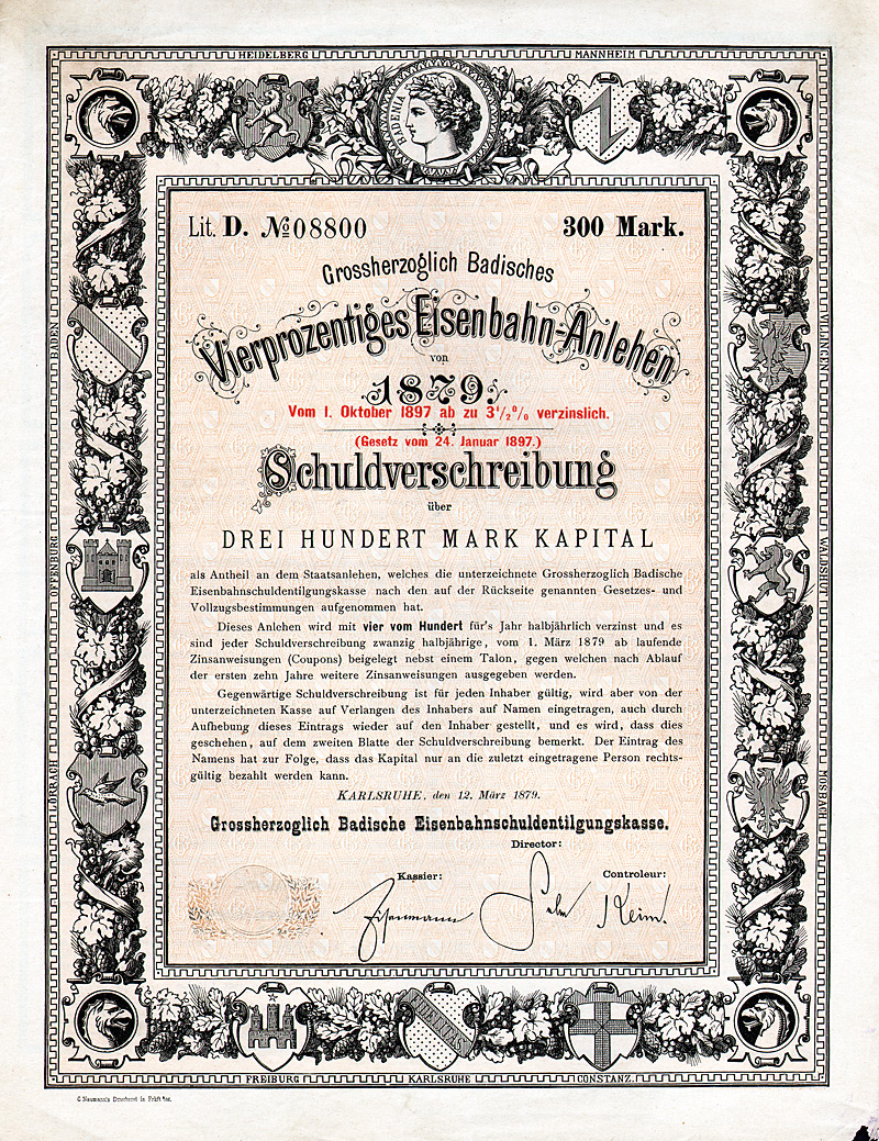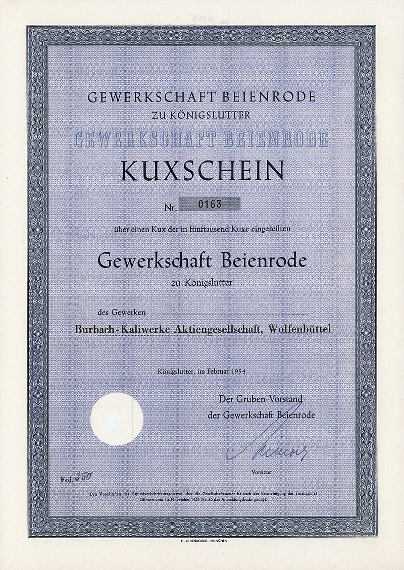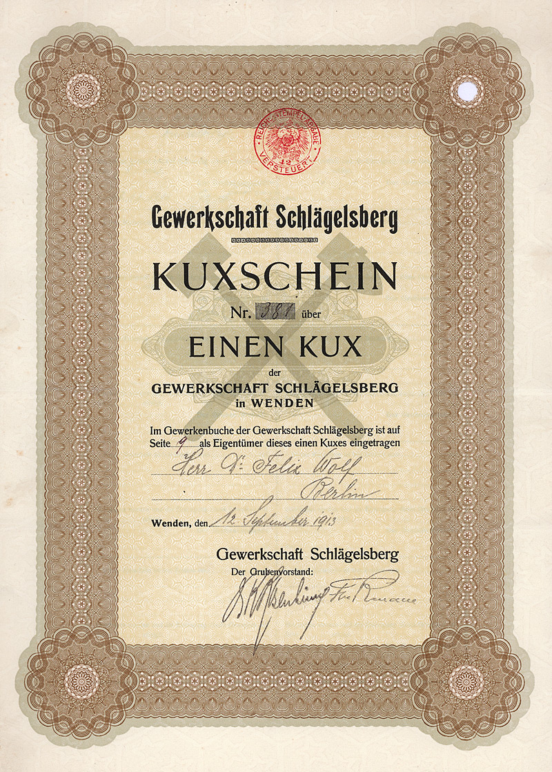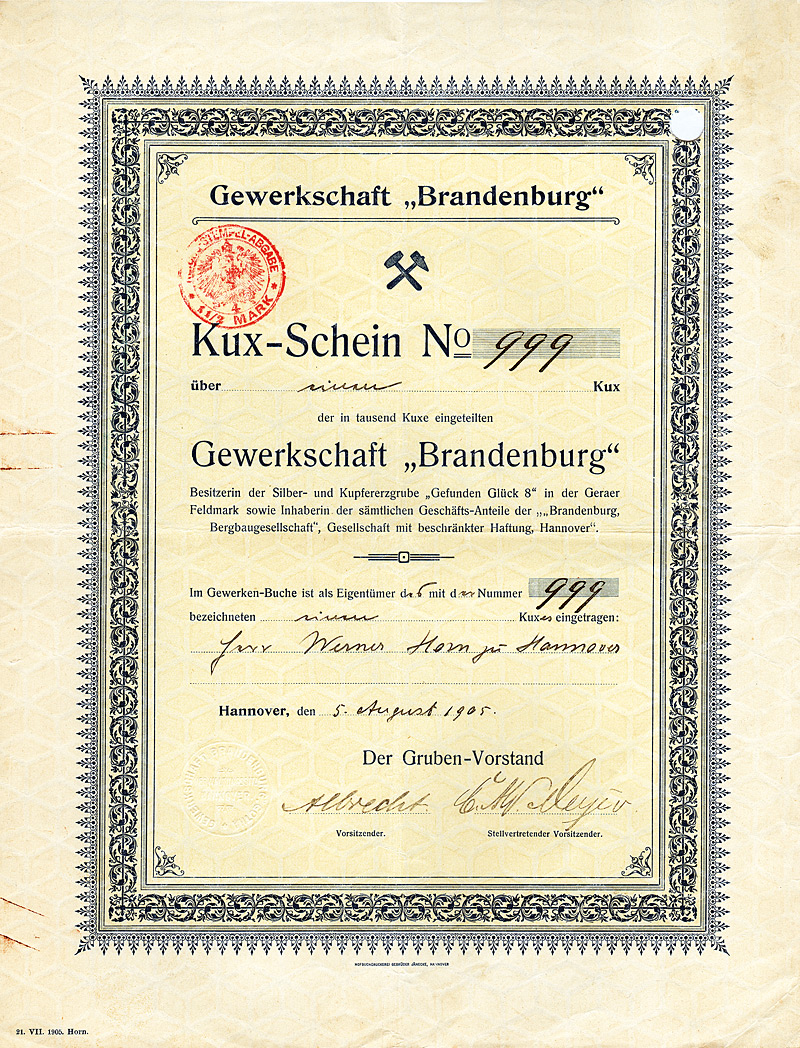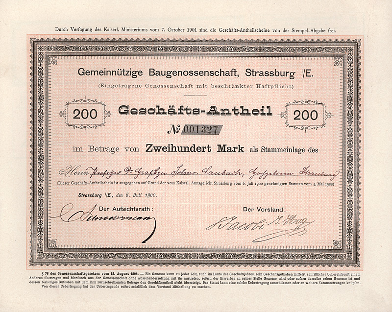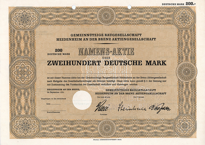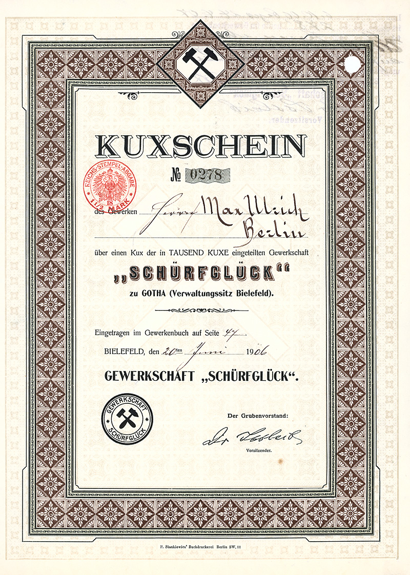 Auflage 2.000 (R 6). Hochformat mit schöner Umrahmung. Mit Faksimile-Unterschrift des Bankiers Münchmeyer. Maße: 37,6 x 26,5 cm. Doppelblatt, inwendig und rückseitig mehrere Übertragungsvorgänge bis 1941. Nicht entwertetes Stück in einem sehr guten Erhaltungszustand.