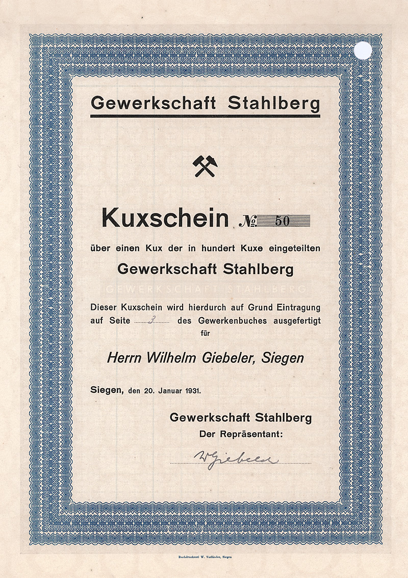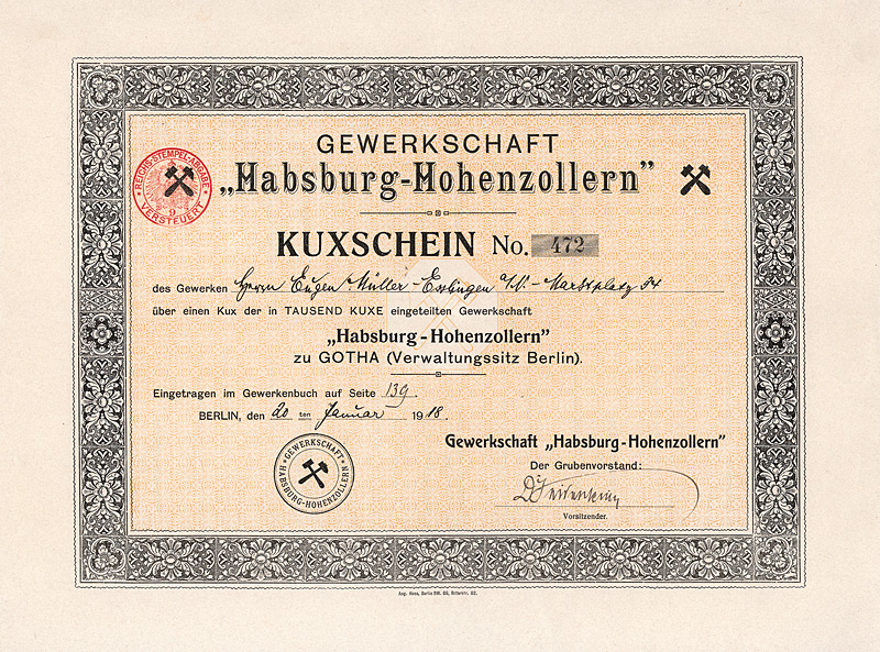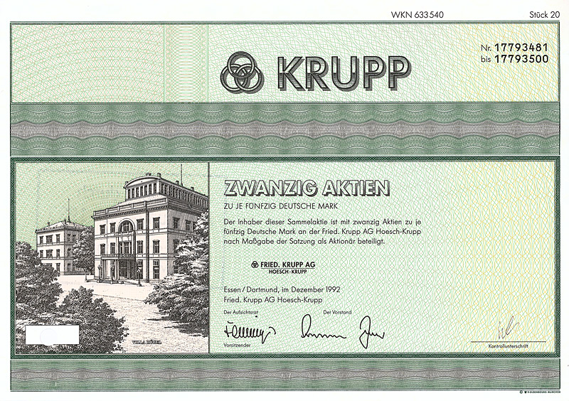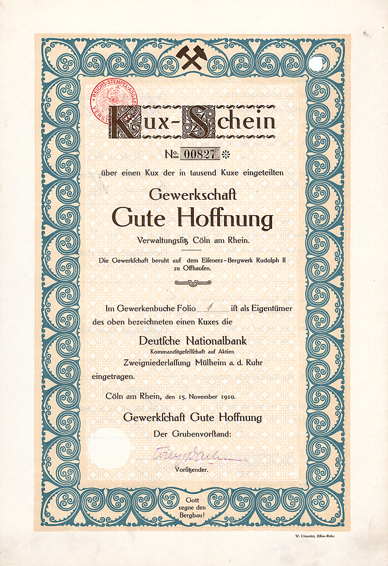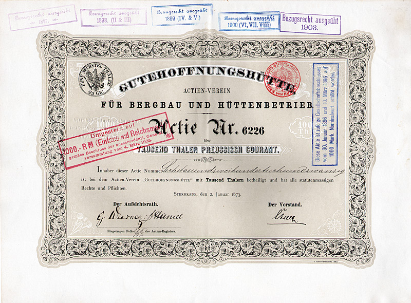 Gründeraktie (R 8). Gründung 1808/10 als Gewerkschaft, ab 1872 AG. Die Gesellschaft gilt als Keimzelle der Schwerindustrie des Ruhrgebietes. Drei 1808/10 in der “Hüttengewerkschaft und Handlung Jacobi, Haniel & Huyssen” in Sterkrade zusammengefasste Hütten waren der Ursprung: die 1758 zu Osterfeld vom Münsteraner Domkapitular Freiherr von der Wenge zu Dieck errichtete St. Antony-Hütte zu Osterfeld, 1793 in den Besitz der Fürstäbtissin Maria Kunigunde von Essen übergegangen, 1799/1805 an den Hütteninspektor Gottlob Jacobi und seine Schwager Franz und Gerhard Haniel aus Ruhrort verkauft; weiterhin die Hütte Gute Hoffnung in Sterkrade, zu deren Bau Friedrich der Große 1781 die Erlaubnis erteilt hatte, die aber wegen des Emporkommens der Anthony-Hütte zahlungsunfähig wurde, in der Zwangsversteigerung von der Mutter Friedrich Krupps erworben und 1808 an Heinrich Huyssen aus Essen und dessen Schwager Gottlob Jacobi und Gerhard und Franz Haniel weiterverkauft wurde; schließlich die im Auftrag der Fürstäbtissin von Essen 1791 durch Gottlob Julius Jacobi errichtete Eisenhütte Neu-Essen im Emschertal bei Schloss Oberhausen, 1805 ebenfalls an den Jacobi-Haniel-Clan verkauft. Durch ununterbrochene Firmenaufkäufe wuchs nach Gründung der AG ein riesiges Gebilde aus Bergwerken, Hütten- und Walzwerken und weiterverarbeitenden Betrieben. Heute als MAN/GHH einer der bedeutendsten Maschinen- und Anlagenbau-Konzerne. Dekorativ, Originalunterschrift von Haniel. Maße: 26,3 x 35,7 cm. Doppelblatt. Nicht entwertetes Stück in einem sehr guten Erhaltungszustand, sehr günstig ausgerufen!