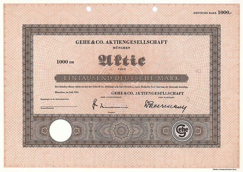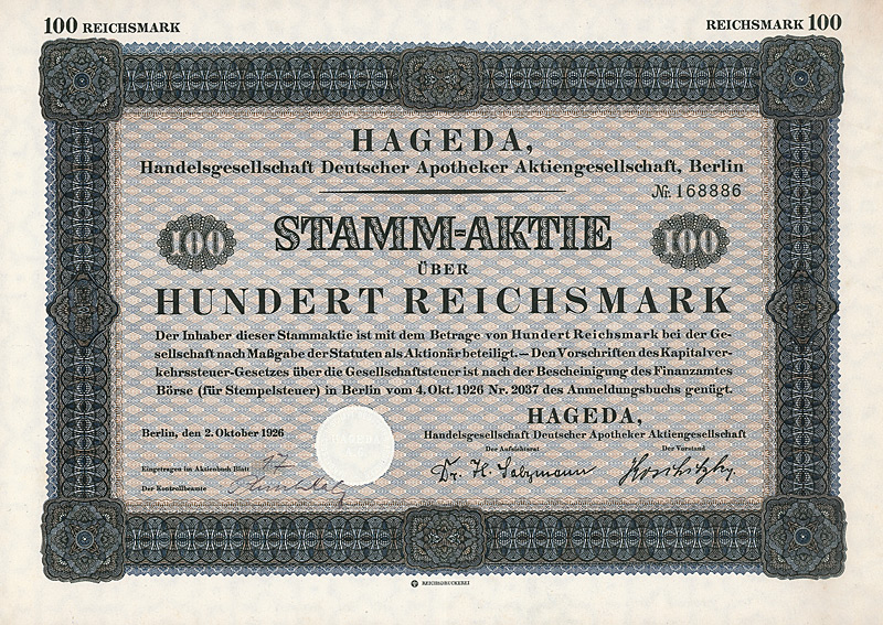 Auflage 17.000 (R 10). Gründung 1902 als “Einkaufsgenossenschaft der Apothekenbesitzer Berlins”. 1904 Umwandlung in die “Handelsgesellschaft deutscher Apotheker mbH”, seit 1921 AG. In rascher Folge wurden im ganzen Reich Zweigniederlassungen errichtet, so 1904 in München, 1905 in Köln, 1908 in Dresden, 1911 in Breslau und Hamburg, 1912 in Frankfurt (Main). 1906 Errichtung einer eigenen Verbandstoff-Fabrik, 1911 einer Fabrik für Ampullen. Gleichzeitig Ausbau der Abt. Reagenzien und der homöopathischen Abteilung. 1915 Bau einer Salbenfabrik. Ab 1922 auch Herstellung bakteriologischer Präparate. 1924 Errichtung einer Tabletten-, Dragier- und Pillenfabrik in Berlin-Reinickendorf. Für den riesigen Fuhrpark bestand sogar ein eigener Karosseriebaubetrieb (die 1920 gegründete Brandenburgische Automobil-Reparaturwerkstatt GmbH). 1950 Sitzverlegung nach Köln. Die AG ist bis heute börsennotiert und gehört mit fast 5 Mrd. € Jahresumsatz zu den führenden deutschen Pharmagroßhändlern. Großaktionär ist mit über 95 % die Familie Merckle in Blaubeuren. Maße: 21 x 29,7 cm. Nicht entwertet!