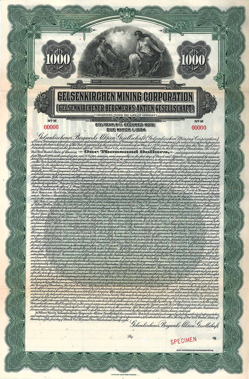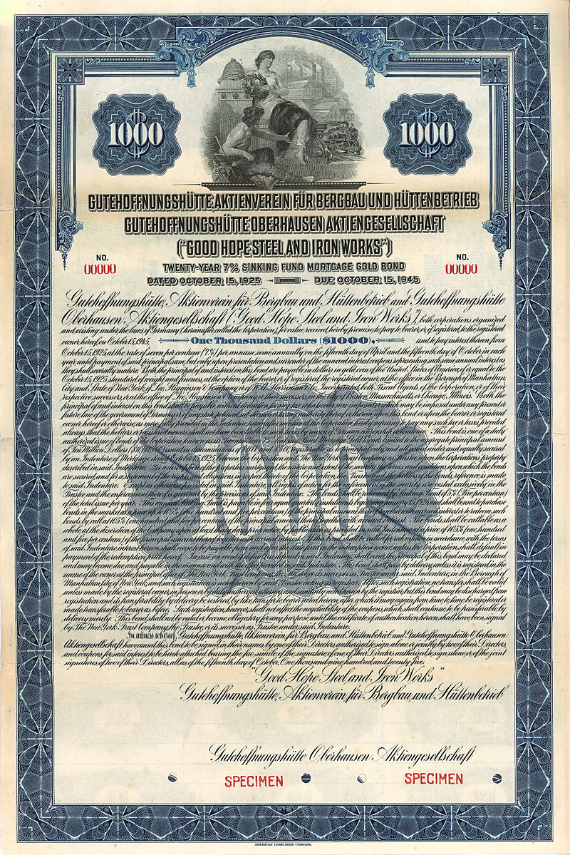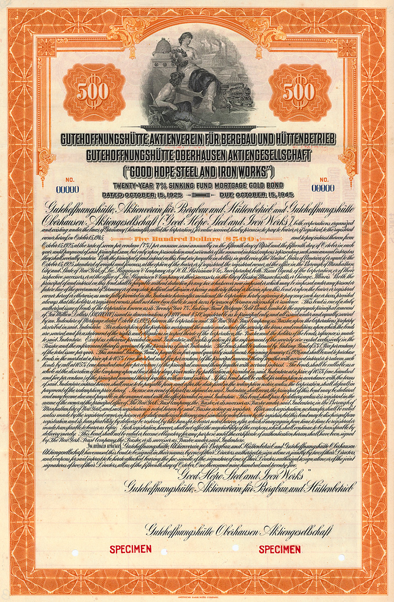 Nullgeziffertes Specimen (R 10). Gemeinschaftsanleihe der beiden GHH-Unternehmen im Volumen von 10 Mio. $. Stahlstich, allegorische Vignette mit großem Hüttenwerk und Dampflok. Maße: 38,2 x 25,3 cm. Mit anh. Kupons, lochentwertet. Die obere Knickfalte leicht gebräunt und am linken Rand abgesplittert.