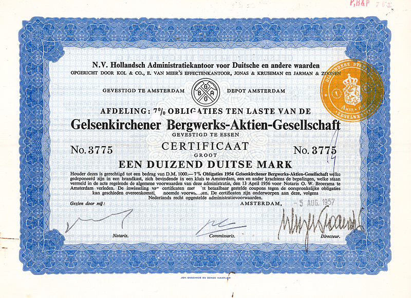 (R 10) An sich schon 1953 begebene Anleihe unter der Garantie der Stadt Hagen von bis zu 1,325 Mio. hfl., die der Umschuldung einer ursprünglich schon 1930 in Holland begebenen Anleihe diente. Maße: 35 x 22,2 cm. Entwertet, Abheftlochung.