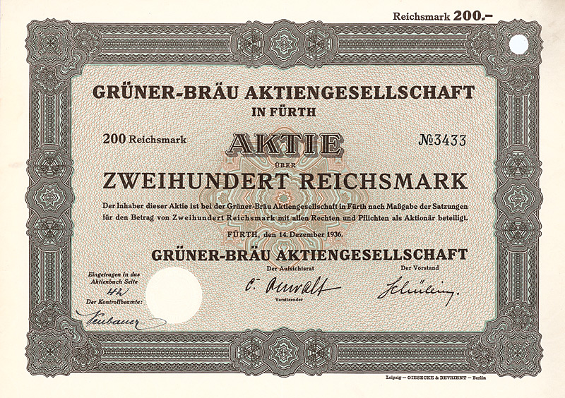 Auflage 1.400 (R 8). Gründung des Stammhauses bereits 1690, AG ab 1896 als Actienbrauerei Erlangen vorm. Gebr. Reif. Am 8.4.1905 wurde die Brauerei H. Henninger in Erlangen erworben, beide Betriebe vereinigt und die Firma umbenannt in H. Henninger-Reifbräu AG. 1918/19 Verkauf der Mälzerei an die Konsumgenossenschaft Erlangen. Erwerb der 1. Erlanger Aktienbrauerei vorm. Karl Niklas. Bis 1972 war die AG eigenständig, dann wurde sie in die neu gegründete “Patrizier-Bräu AG” in Nürnberg eingebracht. Maße: 26,5 x 35,8 cm. Doppelblatt, lochentwertet.