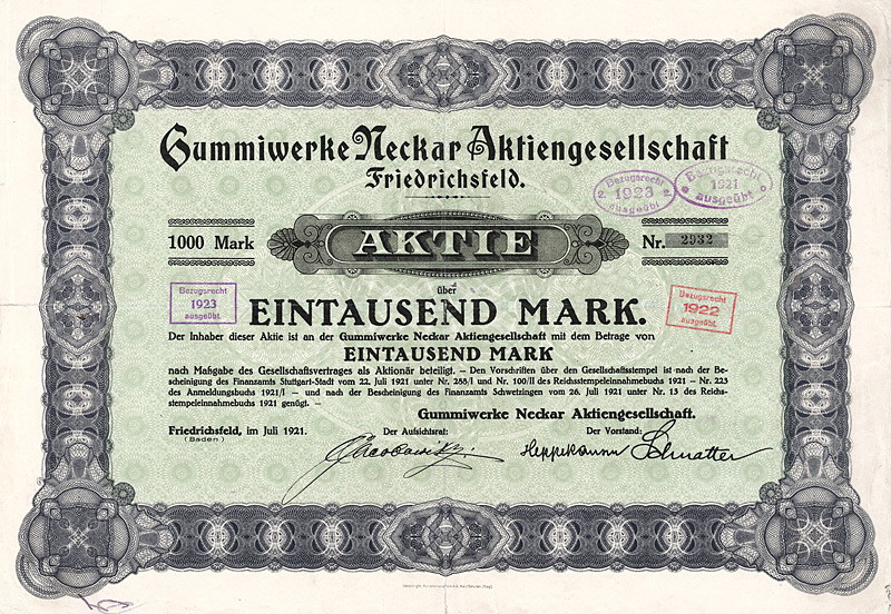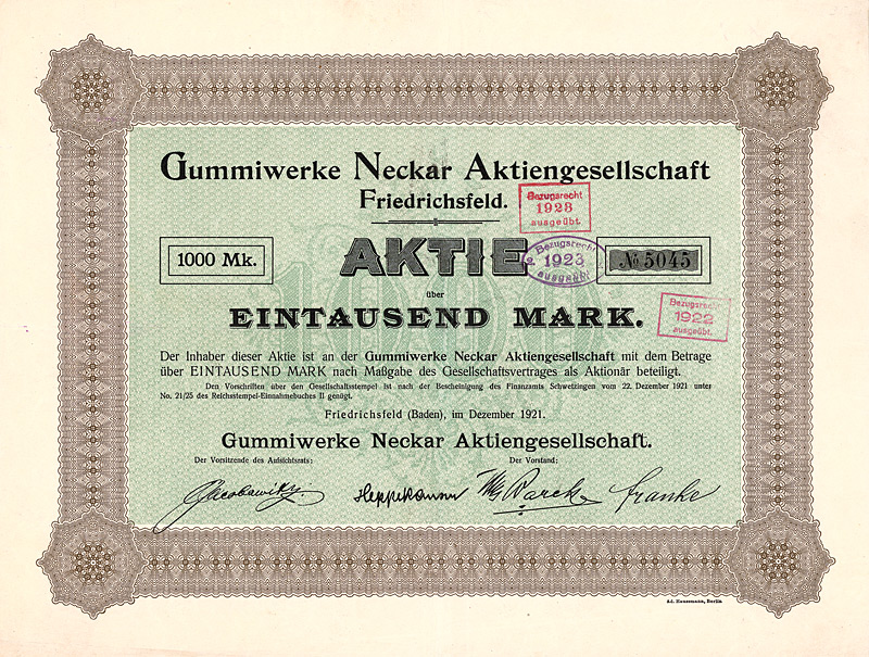 Gründeraktie, Auflage 5.000 (R 9). Gründung im Mai 1921 als AG für Erwerb und Verwertung von Rechten an Industrieunternehmungen in Stuttgart, im Juni Umbenennung wie oben. 1923 Sitzverlegung von Friedrichsfeld nach Heidelberg-Wieblingen. Börsennotiz Freiverkehr Frankfurt. Im Februar 1926 in Liquidation. Maße: 26,3 x 38 cm. Niedriger Startpreis!