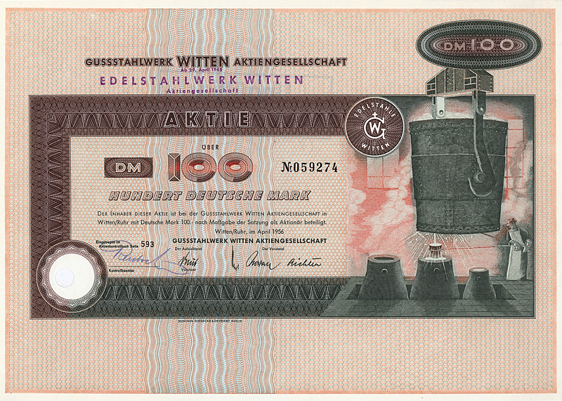 Auflage 23.000. Gründung 1854, Umwandlung 1873 in die AG Gussstahl- und Waffenfabrik Witten vorm. Berger & Co. 1930 vorübergehend Einbringung der Werksanlagen in die Ruhrstahl AG (Vereinigte Stahlwerke AG). 1947 Neugründung im Zuge der Entflechtung der Vereinigten Stahlwerke auf alliierte Anordnung. Zu den Stahl-, Walz- und Hammerwerken kam 1960/62 noch ein Draht- und Feinwalzwerk, 1963/64 außerdem Übernahme des Beriebes der ehemaligen Stahlwerk Mark AG in Wengern. 1965 Umfirmierung in Edelstahlwerk Witten AG, 1975 Abschluß eines Beherrschungsvertrages mit der August Thyssen-Hütte AG. Bis zum Squeeze-Out 2002 an fast allen deutschen Börsen amtlich notiert gewesen. Sehr dekorativ, eindrucksvolle Innenansicht einer Stahlgießerei. Maße: 21 x 29,8 cm. Prägesiegel lochentwertet.