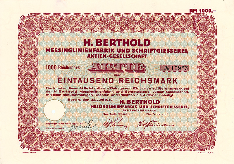 Auflage 333. Gründung 1858, AG seit 1896. Erzeugnisse: Schriften und Messinglinien für Buchdruckzwecke, Bedarfsartikel für das graphische Gewerbe. Berthold expandierte rasch: Übernommen wurde 1897 die Schriftgießerei Bauer & Co. in Stuttgart und Düsseldorf, 1899 Errichtung einer Fabrik in St. Petersburg, ferner übernommen 1905 J. H. Rust & Co. in Wien, 1917 Emil Gursch in Berlin, 1918 die Schriftgießereien Gottgried Böttger, F. A. Brockhaus, C. F. Rühl in Leipzig und A. Kahle Söhne in Weimar, 1920 Julius Klinkhardt in Leipzig, 1922 C. Kloberg in Leipzig und 1928 die Schriftgießerei der A.-G. für Schriftgießerei und Maschinenbau in Offenbach/Main. In Riga bestand bei der H. Berthold Schriftgießerei H. Leunig & Co. eine 100 %ige Beteiligung, außerdem mit je 50 % bei der Erste ungarische Schriftgießerei AG in Budapest und der Haas’sche Schriftgießerei AG in Münchenstein bei Basel beteiligt. Mit dem Niedergang des Buchdrucks mußte das Produktionsprogramm ab Ende der 60er Jahre völlig umgestellt werden: Berthold wurde zum größten Hersteller von Fotosetzmaschinen in Europa. 1971 umfirmiert in H. Berthold AG, 1979 Umzug in die vormalige Fabrik der Loewe Opta GmbH in Berlin-Steglitz. Die immensen Entwicklungskosten der völlig neuen Fotosatz-Technologie (bei der auch schon Lasertechnik zum Eisantz kam) wurden aber nie wieder eingespielt: 1993 ging die Traditionsfirma in Konkurs. Maße: 21 x 29,8 cm. Prägesiegel lochentwertet.