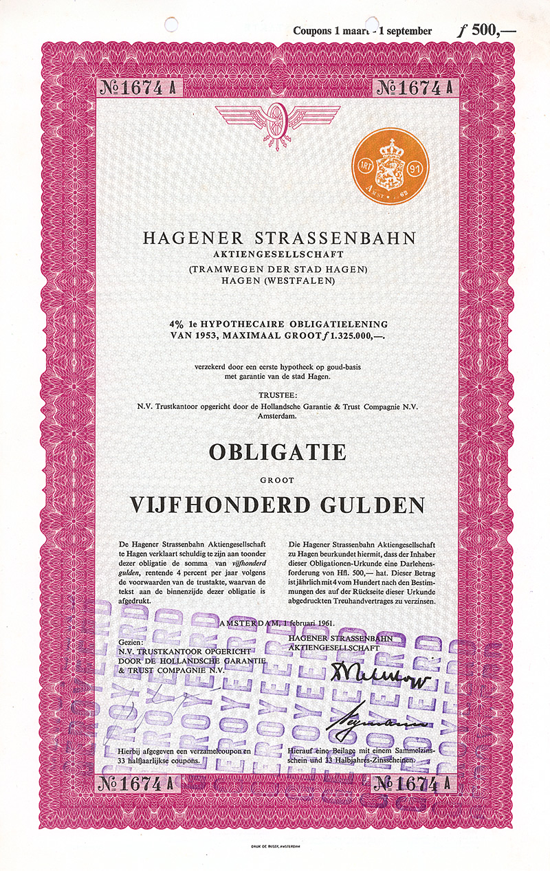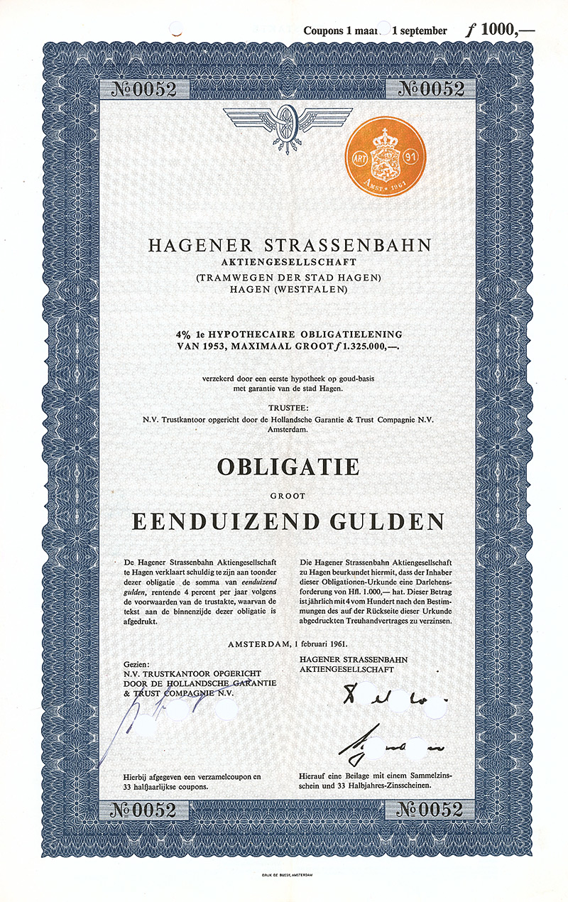 (R 10) Gegründet 1897 durch die Accumulatorenfabrik Hagen (heute VARTA) und Siemens & Halske zur Übernahme der 1884 als Pferdebahn eröffneten und 1896 elektrifizierten Straßenbahn in Hagen. 1900 Erwerb der Eckeseyer Straßenbahn. 1911 Übernahme der 6,1 km langen Linie Hagen-Hohenlimburg von der Westfälischen Kleinbahnen AG. 1926 Erwerb der Mehrheit an der 18,4 km langen, 1903/07 eröffneten Kleinbahn Haspe-Voerde-Breckerfeld GmbH, die Bahnanlagen wurden 1931 vollständig übernommen. Nach dem Krieg dünnte das Liniennetz langsam aus (1951 noch 72 km, 1966 nur noch 38 km), 1976 wurde der Straßenbahnbetrieb ganz eingestellt. An sich schon 1953 begebene Anleihe unter der Garantie der Stadt Hagen von bis zu 1,325 Mio. hfl., die der Umschuldung einer ursprünglich schon 1930 in Holland begebenen Anleihe diente. Maße: 34,9 x 22,1 cm. Unterschriften lochentwertet, oberer Rand mit Abheftlochung.