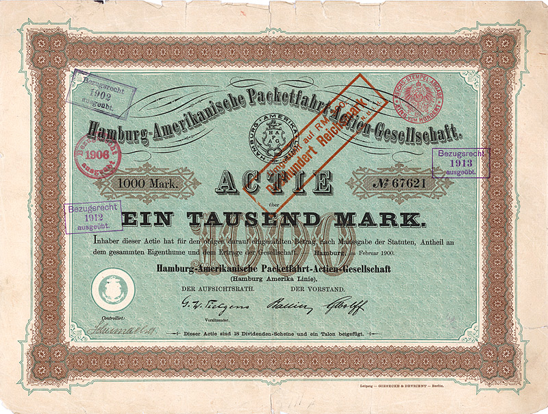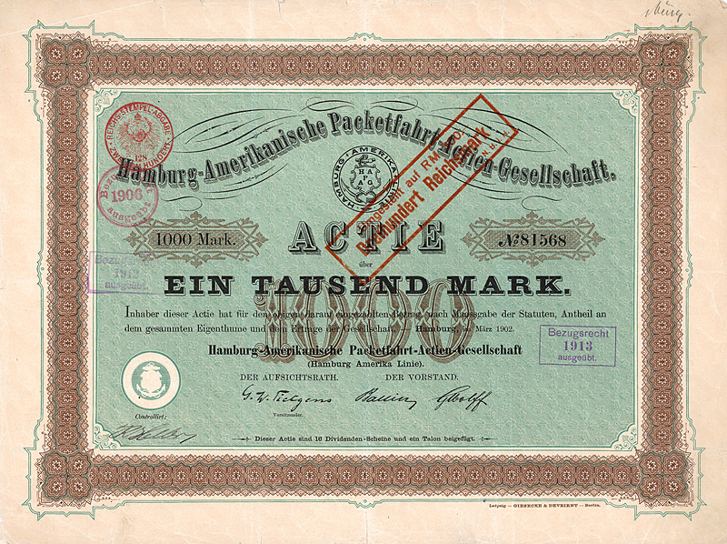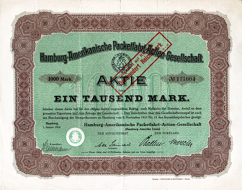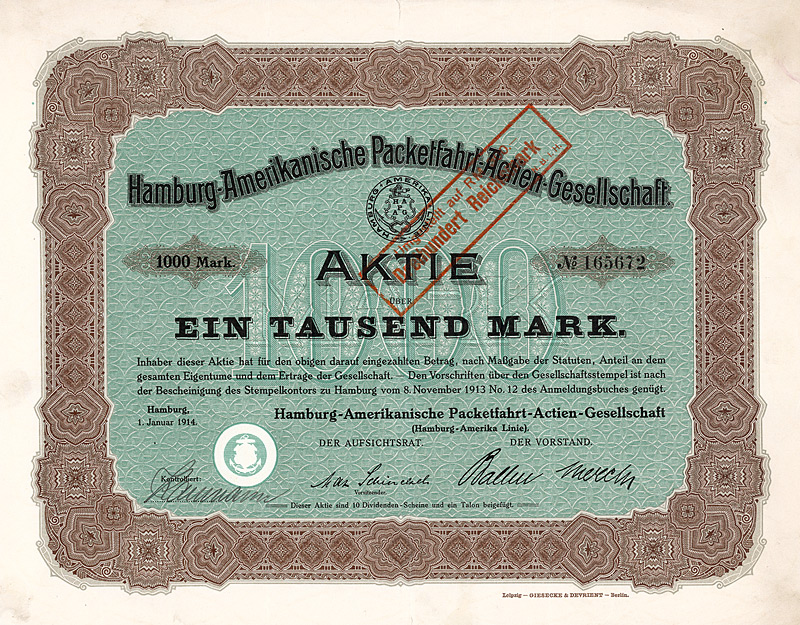 Auflage 15.000 (R 11). Gründung 1847. Drei große Segler waren die ersten Fahrzeuge der Hamburg-Amerika-Linie, die aber bald durch Dampfschiffe ersetzt wurden. Ende des 19. Jh. war die Flotte auf über 40 Dampfer angewachsen. Befahren wurden die Linien von Hamburg nach New York, Baltimore, Philadelphia, Boston, Canada, New Orleans, von Stettin nach New York sowie von Italien nach New York und nach Argentinien. Verträge sicherten der HAPAG die Beförderung der deutschen, englischen, französischen, amerikanischen und italienischen Post über den Atlantik. Bis in die 1870er Jahre von eher nur regionaler Bedeutung, doch unter Albert Ballin (1857-1918), der 1899 Generaldirektor der HAPAG wurde, entstand ein Unternehmen von weltumspannender Bedeutung. Seine absolute Blütezeit erreichte es 1914 mit einer Flotte von 1.360.000 Bruttoregistertonnen, darunter mit den Dampfern “Imperator”, “Vaterland” und “Bismarck” die größten Schiffe der Welt. Die Folgen des 1. Weltkrieges bedeuteten eine schwere Zäsur: Aufgrund des Versailler Vertrages musste die gesamte Flotte an die Entente-Staaten abgeliefert werden. Der Wiederaufbau war mühsam, erst mit der 1926 erfolgten Übernahme der Deutsch-Austral-, Kosmos- und Hugo-Stinnes-Linien kam die HAPAG wieder in die Reihe der größten Reedereien der Welt. 1930 kam mit dem Bremer Erzkonkurrenten, dem Norddeutschen Lloyd, ein Gemeinschaftsvertrag zustande, außerdem war die HAPAG Hauptvertreter der Deutschen Zeppelin-Reederei und Generalvertreter für die “Deutsche Lufthansa AG”. 1970 Fusion von HAPAG und dem 1857 gegründeten Norddeutschen Lloyd zur heutigen Hapag-Lloyd AG. Nun eine Tochter der früheren Preussag (heute TUI), tätig in den Bereichen Seeschifffahrt, Transport, Seehafenbetriebe, Reisebüros, Flugtouristik. Erst 2005 wurde diese TUI-Sparte durch Kauf der CP-Ships (Schiffahrtssparte der Canadian Pacific Railway) noch einmal kräftig gestärkt. Mit Faksimile-Unterschriften von Gust. W Tietgens, Albert Ballin und Guido Wolff. Maße: 25,3 x 33,9 cm. Knickfalten und Randeinrisse. Rarität aus einem Nachlaß, museal.