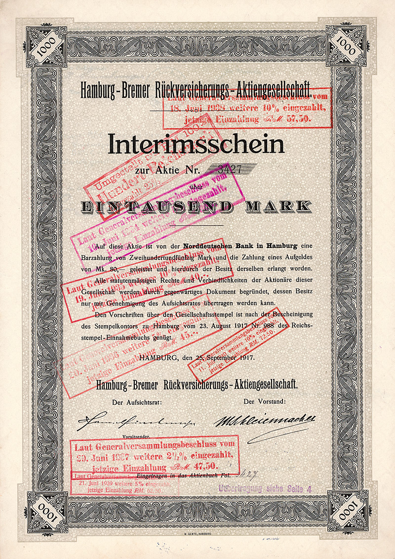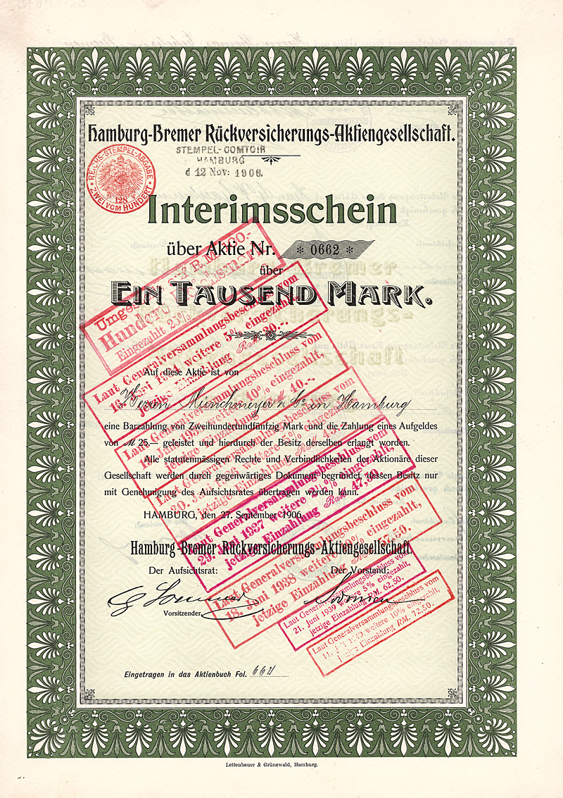 Gründeraktie, Auflage 1.000 (R 10). Gegründet 1906 von der Hamburg-Bremer Feuer als Auffanggesellschaft für die “Hamburg-Bremer Allgemeine Rück”, die unter den Folgen der Erdbebenkatastrophe in San Francisco 1906 zusammengebrochen war. Börsennotiz: Freiverkehr Hamburg. 1980 verschmolzen mit der HIR Hamburger Internationale Rückversicherungs-AG (Konzerntochter der früheren Volksfürsorge Lebensversicherung AG); die HIR wurde 1982-84 “zerlegt”, teilverkauft; der Restmantel ist heute als HIR eine Chilington-Tochter und im run-off-Bereich tätig. Sehr schöne Umrahmung mit Lilien-Ornamenten. Maße: 37,6 x 26,6 cm. Doppelblatt, inwendig mehrere Übertragungen bis 1937.