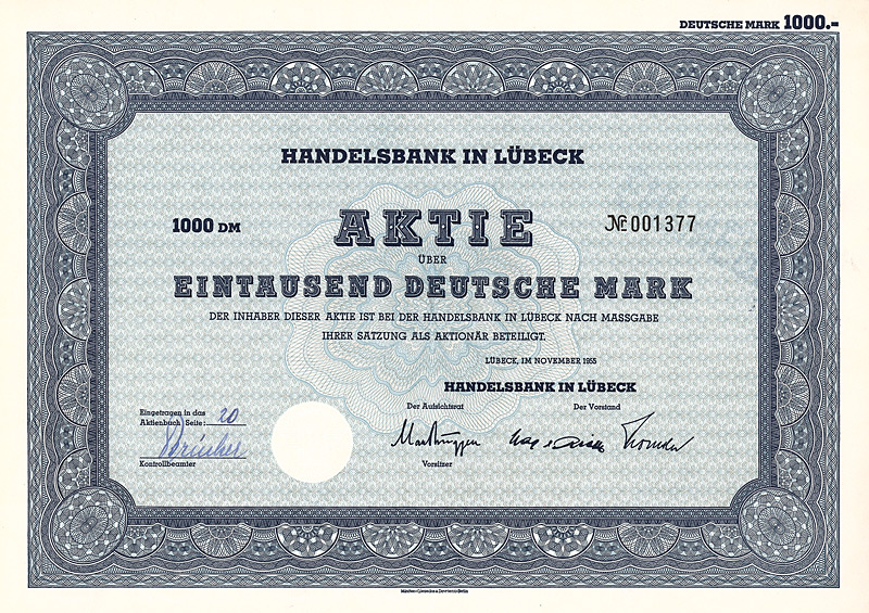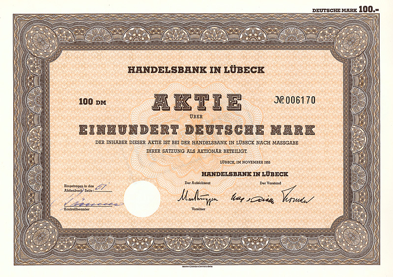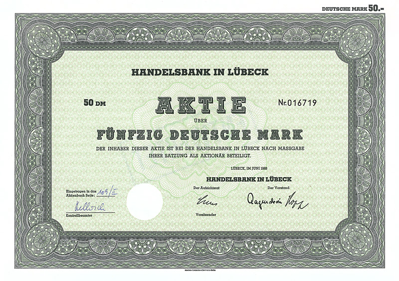 Auflage 900 (R 8). Die älteste Lübecker Bank. Gründung 1856 als “Credit- und Versicherungsbank in Lübeck”, schon 1859 umbenannt in “Commerz-Bank in Lübeck”. 1937 Zusammenschluß mit der Lübeckischen Kreditanstalt (Staatsanstalt), 1938 Übernahme des Bankgeschäftes Alfons Frank & Co. 1940 Umfirmierung zur “Handelsbank in Lübeck”, um Verwechslungen mit der “großen” Commerzbank zu vermeiden. 1943 Verschmelzung mit dem Spar- und Vorschuß-Verein AG, Bad Schwartau. Mit 55 Geschäftsstellen die Regionalbank des Lübecker Raumes einschließlich der Kreise Stormarn, Ost-Holstein und Herzogtum Lauenburg. Börsennotiz Berlin und Hamburg. Lange war die Hansestadt Lübeck größter Aktionär, Ende der 70er Jahre kauften sich die Commezbank (über 25 %) und die Deutsche Bank (über 50 %) ein. 1988 umbenannt in “Deutsche Bank Lübeck AG”, 2003 nach squeeze-out der letzten Kleinaktionäre komplett in die Deutsche Bank eingegliedert. Maße: 21 x 29,7 cm. Rückseitig als entwertet abgestempelt.