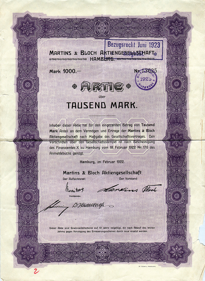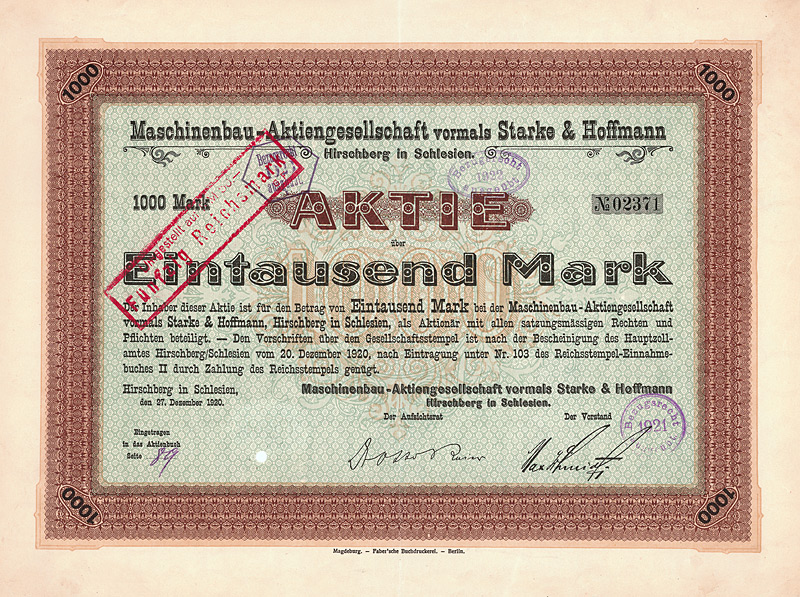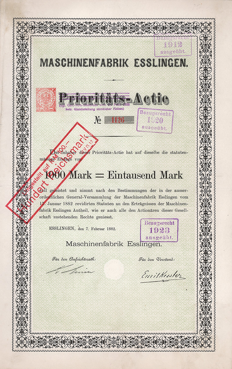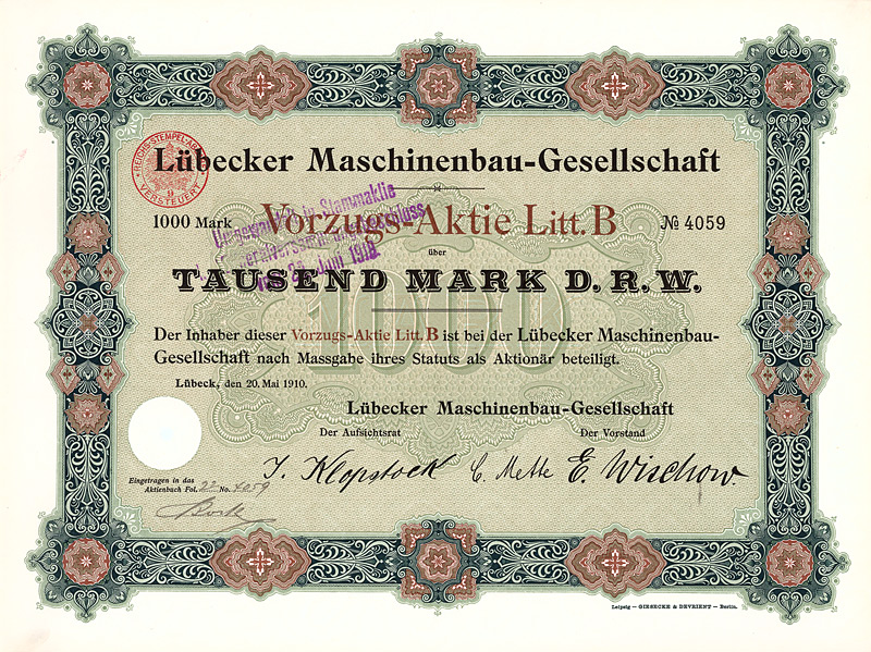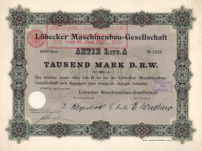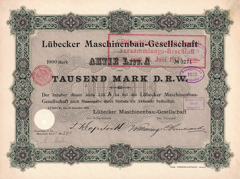 Auflage 1.100, 844 Stücke aus Umwandlung der Neuen Vorzugs-Aktien in Stamm-Aktien und 256 Stamm-Aktien aus Kapitalerhöhung. Gründung 1873. Die Gesellschaft stellte Fluß-, See-, Trocken- und Kohlenbagger her, ferner Taucherglocken, Dampf- und Schiffsmaschinen. Börsennotiz Hamburg und Berlin. Ab 1911 enge Interessengemeinschaft mit der Orenstein & Koppel AG in Berlin, 1948 mit dieser fusioniert. Zuletzt eine noch börsennotierte (und nicht ganz sorgenfreie) Tochter des Krupp-Hoesch-Konzerns. Maße: 27 x 36,2 cm. Hochwertiger Druck von Giesecke & Devrient. Prägesiegel lochentwertet.