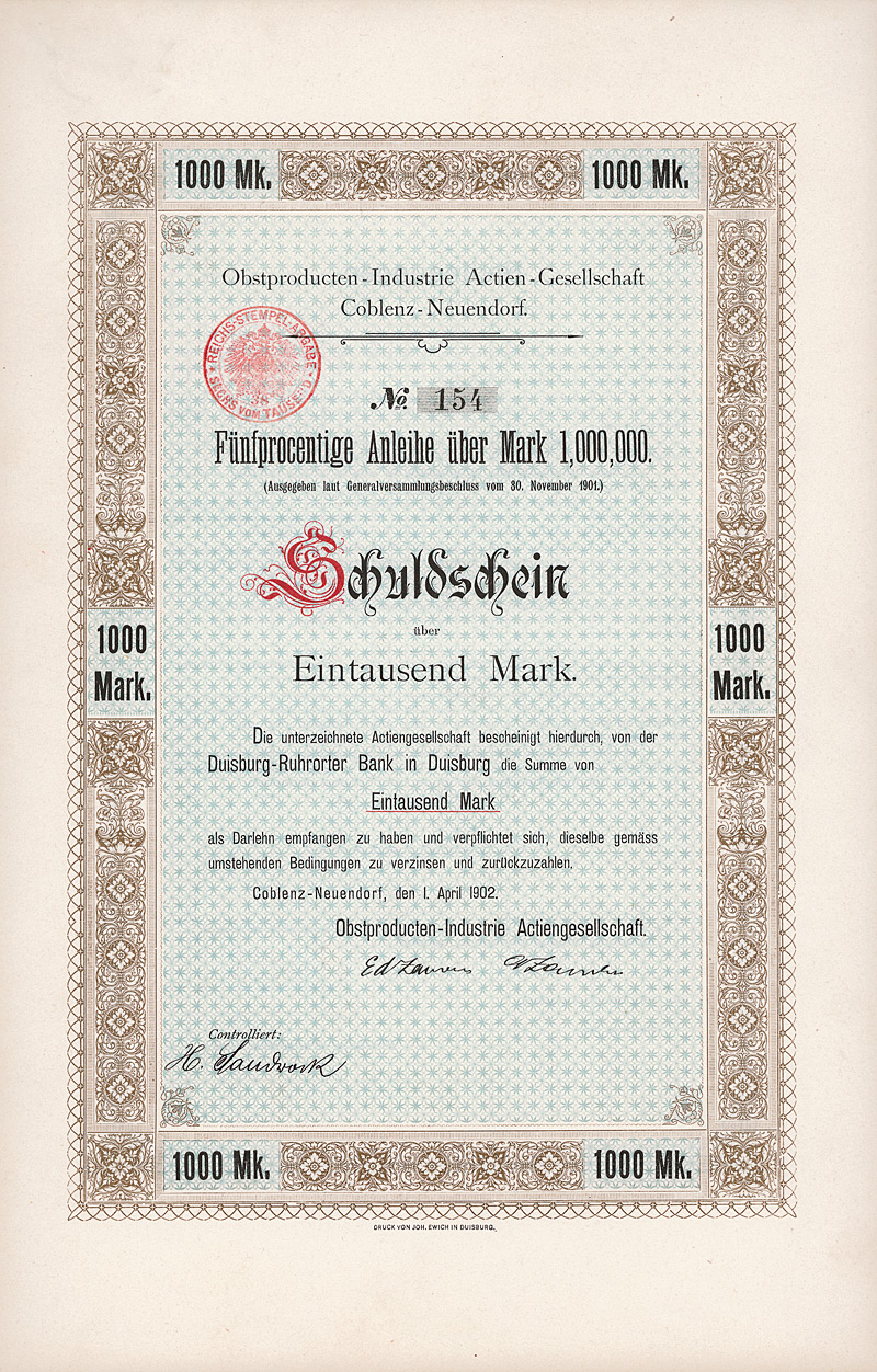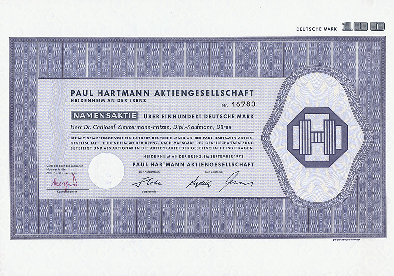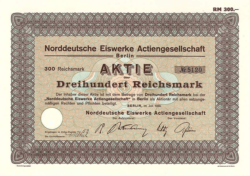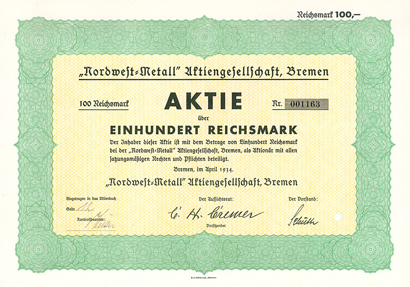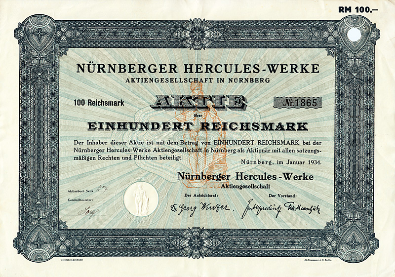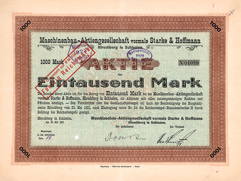Auflage 1.100, 844 Stücke aus Umwandlung der Neuen Vorzugs-Aktien in Stamm-Aktien und 256 Stamm-Aktien aus Kapitalerhöhung. Gründung 1873. Die Gesellschaft stellte Fluß-, See-, Trocken- und Kohlenbagger her, ferner Taucherglocken, Dampf- und Schiffsmaschinen. Börsennotiz Hamburg und Berlin. Ab 1911 enge Interessengemeinschaft mit der Orenstein & Koppel AG in Berlin, 1948 mit dieser fusioniert. Zuletzt eine noch börsennotierte (und nicht ganz sorgenfreie) Tochter des Krupp-Hoesch-Konzerns. Maße: 27 x 36,2 cm. Hochwertiger Druck von Giesecke & Devrient. Prägesiegel lochentwertet.