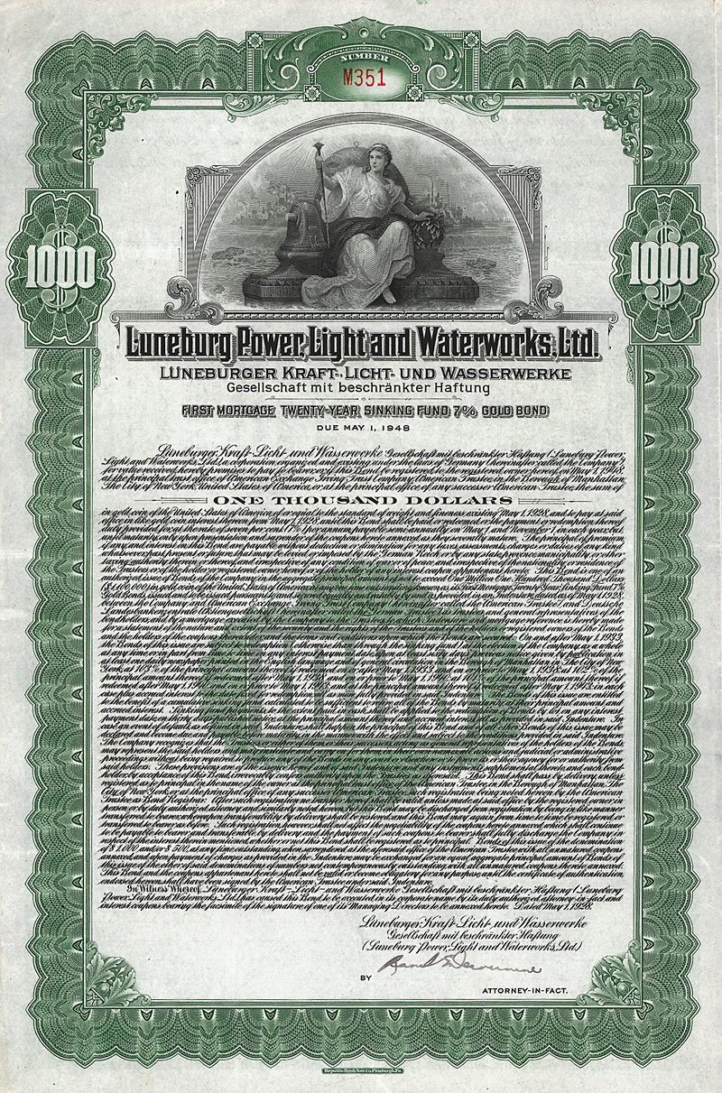 Auflage 1.100 (R 8). Teil einer in den USA plazierten Anleihe von 1,1 Mio. $. Schöner Stahlstich, allegorische Vignette mit jungem Mädchen, Generator, Fabriken. Maße: 37,5 x 24,5 cm. Mit anhängenden restlichen Kupons 29-40. Nicht entwertet.
