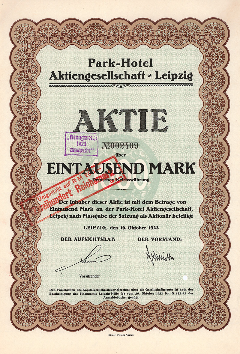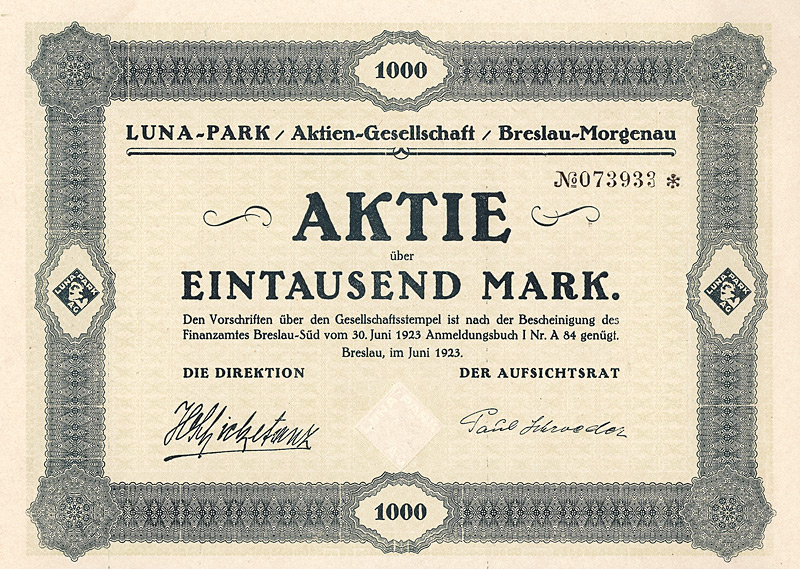 Gründeraktie, Auflage 30.000 (R 7). Gründung 1923 zur Übernahme des bis dahin der KG Reckziegel & Co. gehörenden Lunaparks in Breslau, Morgenaustr. 3/4 (eine Mischung aus Zoo und Vergnügungspark). Seit Juni 1931 wurde der Park von der AG in Eigenregie betrieben, ein Jahr später wegen Unrentabilität vorübergehend geschlossen und am 1.10.1933 wieder eröffnet. Am 1.1.1934 brannte der große Saal fast völlig ab, nach dem Wiederaufbau wurde der gesamte Betrieb am 1.10.1934 in neuem Glanz wiedereröffnet. Ende 1937 Verschmelzung auf den Hauptaktionär, die Bürgerliches Brauhaus Breslau AG. Die ausscheidenden Aktionäre der im Freiverkehr Breslau notierten AG wurden mit 72 % abgefunden. Der in der heutigen ul. Rakowiecka gelegene prachtvolle Festsaal wurde erst kürzlich restauriert und wird heute immer noch unter dem Namen Bürgersäle-Luna Park genutzt. Maße: 17 x 24 cm. Mit kpl. anh. Kupons.