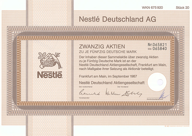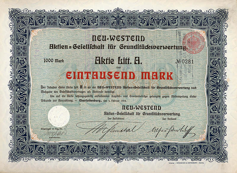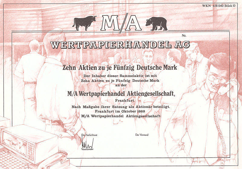 (R 9) Gründung 1989 mit Grundkapital von 0,2 Mio. DM. Zu den Gründern zählten u.a. WESTEND Terrain und Beteiligungsholding AG, Frankfurt, VALORA Vermögensverwaltung AG, Karlsruhe, VALORA Effekten Handel AG, Ettlingen, VBF Vermittlungsges. für Versicherungen, Bausparen und Finanzierungen mbH, Frankfurt. Hochdekorative Gestaltung mit Szene aus dem Börsensaal, oben Stier und Bär. Maße: 21 x 29,6 cm. Mit Kuponbogen.