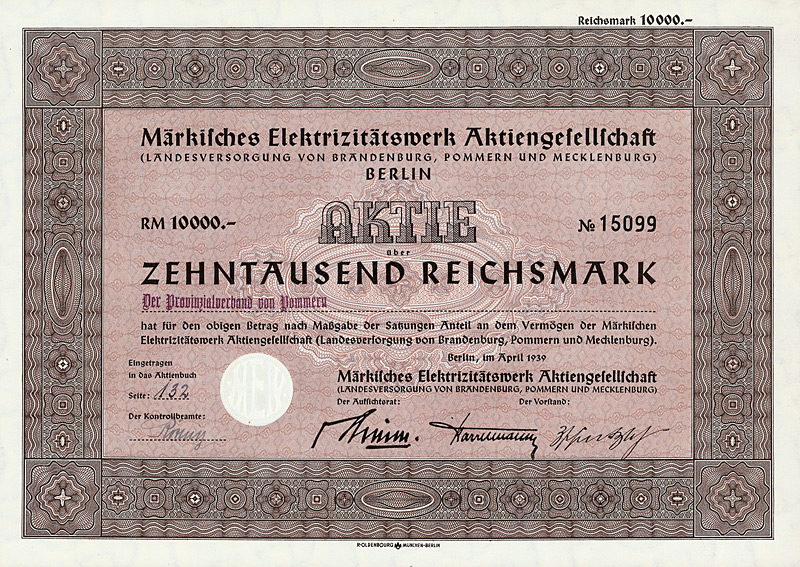 Auflage 1.950 (R 6). Gründung 1900 durch die A.E.G. als erstes Überlandwerk in der Provinz Brandenburg, wo es etwa 100 örtliche Elektrizitätswerke gab. In Finow bei Eberswalde wurde am Hohenzollernkanal nach Plänen von Prof. Klingenberg ein Steinkohlen-Kraftwerk errichtet. 1916 erwarb die Provinz Brandenburg die Aktienmehrheit. 1931 brachte der Freistaat Mecklenburg-Schwerin seine Landeselektrizitätswerke ein. 1934 schließlich wurde die Ueberlandzentrale Pommern eingegliedert. Damit versorgte das MEW 6.412 Städte und Gemeinden in ganz Brandenburg, Mecklenburg und Pommern sowie den Kreis Lüneburg rechts der Elbe. Ausgestellt auf den Provinzialverband von Pommern. Maße: 21 x 29,7 cm. Nicht entwertetes Stück in bester Erhaltung!