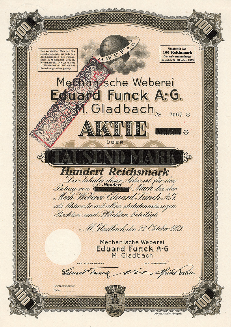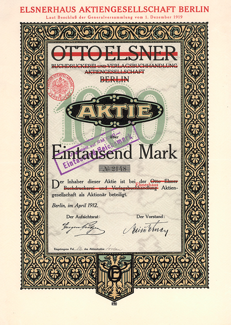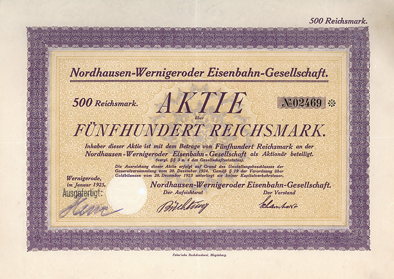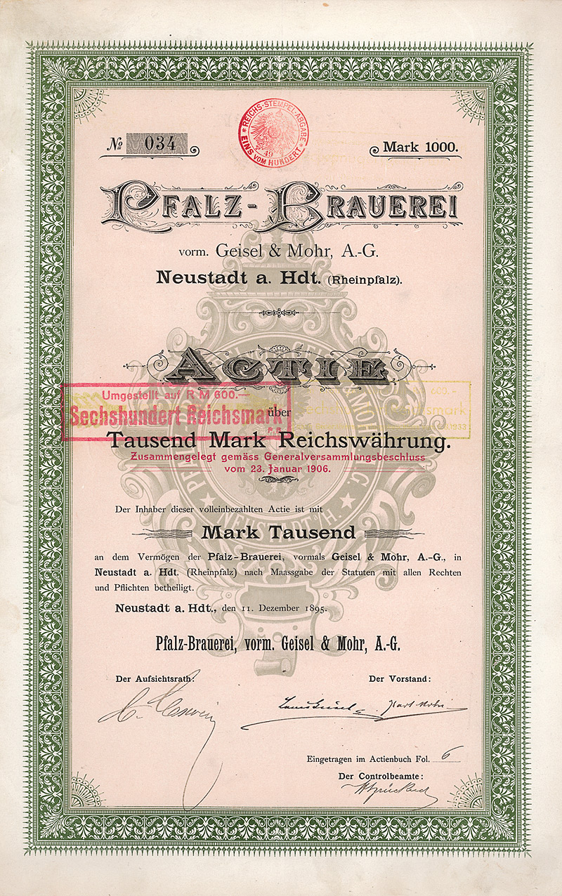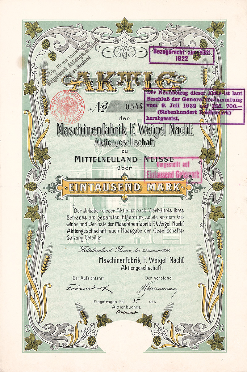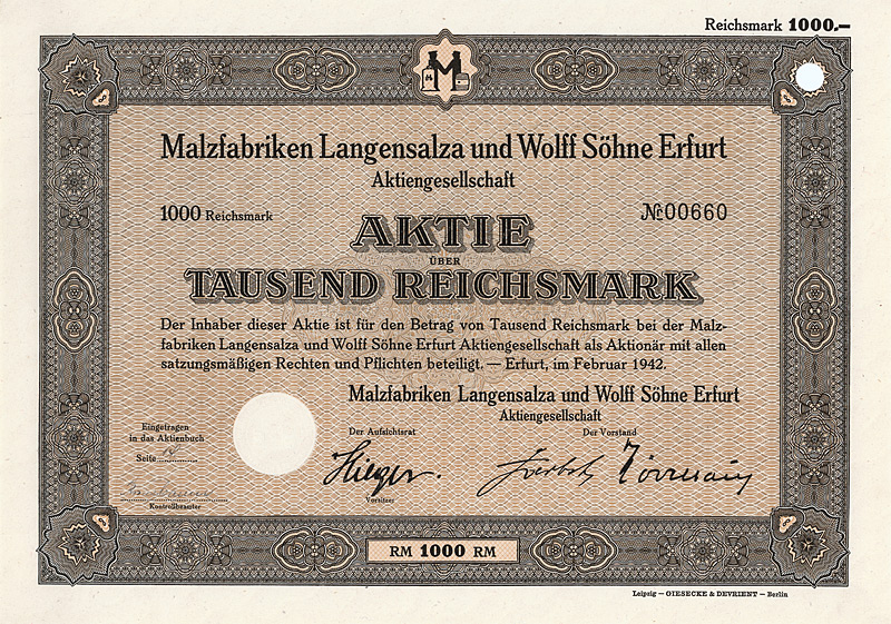 Auflage 1.300, kompletter Neudruck des Aktienkapitals. Gründung 1872 als Aktien Malzfabrik Langensalza. 1915/16 Erwerb der Anlagen der in Konkurs geratenen Mitteldeutschen Malzfabrik in Langensalza, wo danach Hafernährmittel hergestellt wurden. 1921 Übernahme der Malzfabrik Hermann Wolff & Söhne in Erfurt und Umfirmierung in Aktien Malzfabrik Langensalza und Hermann Wolff & Söhne AG (1927 erneute Umfirmierung in Malzfabriken Langensalza und Wolff Söhne Erfurt AG). 1928/29 verhob man sich in der Weltwirtschaftskrise an dem kreditfinanzierten Kauf der Aktienmehrheit des lokalen Erzkonkurrenten Malzfabriken J. Eisenberg & Etgersleben von der Commerzbank und dem Bankhaus A. E. Wassermann für 2,4 Mio. RM: 1932 wurden diese Aktien den beiden Banken gegen Forderungsverzicht zurückübertragen, außerdem mußten den Banken noch 1,2 Mio. RM “Abfindung” gezahlt werden. Nach 1945 enteignet. Hochwertiger Druck von Giesecke & Devrient. Lochentwertet. Maße: 21 x 29,8 cm.
