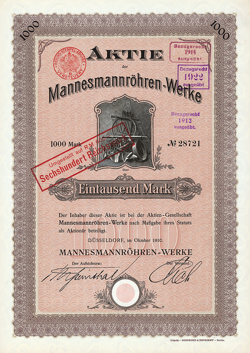 Auflage 7.500, Kapitalerhöhung zur Aufnahme der Gasrohrfabrikation. Ehemals einer der größten deutschen Konzerne in Anlagenbau, Röhrenfertigung, Handel und neuerdings Telekommunikation. Nach einer gewaltigen Übernahmeschlacht im Jahr 2000 von der britischen Vodafone geschluckt. Hochformat, sehr schöner G&D-Druck mit großer symbolhafter Vignette der Metallverarbeitung. Maße: 34,6 x 24,7 cm. Nicht entwertetes Stück!