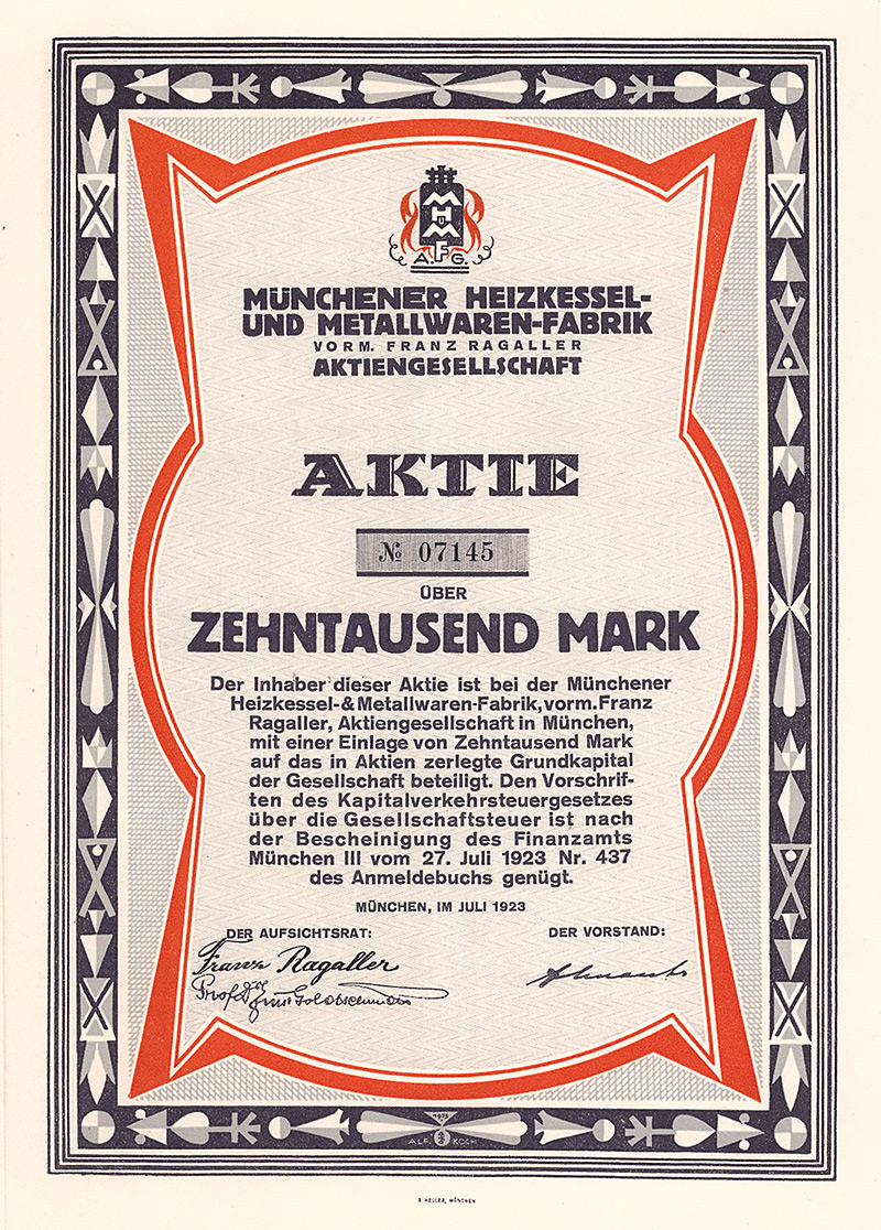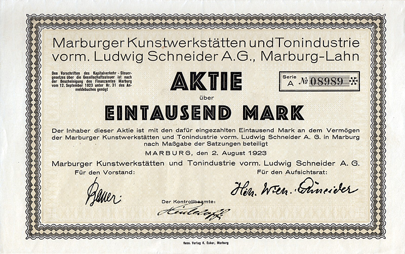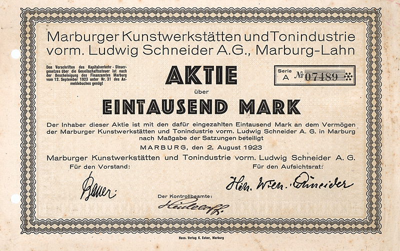 Gründeraktie, Auflage 20.000 (R 9). Gründung am 2.8.1923. Herstellung von Kunstgegenständen aus Ton, Holz oder anderen Stoffen. 1926 in Konkurs. Maße: 14 x 22,5 cm. Mit kpl. anh. Kuponbogen. Extrem niedriger Startpreis!