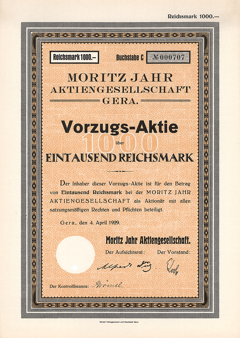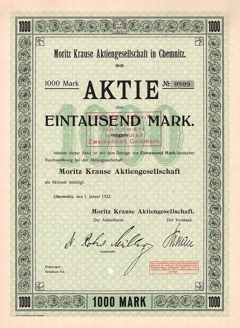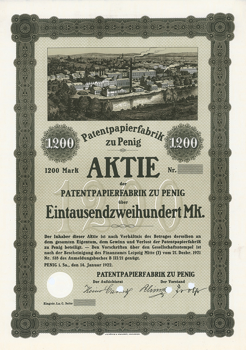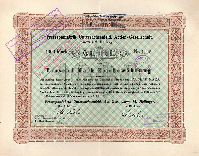 Auflage 900 (R 7). Gegründet 1861, AG seit 1888. Fabrikation von hochglänzenden Pappen, sog. Pressspan, zur Appretur von Stoffen, für Platten mechanischer Musikwerke etc. sowie Papier und Pappen aller Art. 1896 Ankauf der Fabrikanlage Brethaus bei Lauter. Börsennotiz Berlin. Die AG existierte bis 1956, anschließend Umwandlung in eine KG mit staatlicher Beteiligung (bis 1972). Danach VEB und als Werkteil der Pressspan- und Spezialpappenwerke Zwönitz bis 1992 fortgeführt, danach Pressspanfabrik Untersachsenfeld GmbH. Maße: 27,3 x 34 cm. Mit restlichem Kuponbogen.