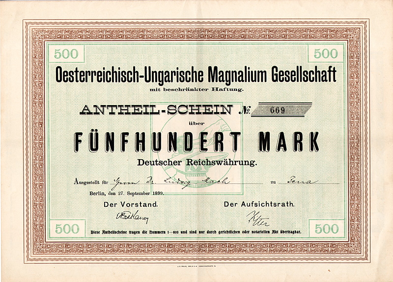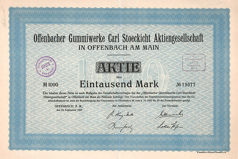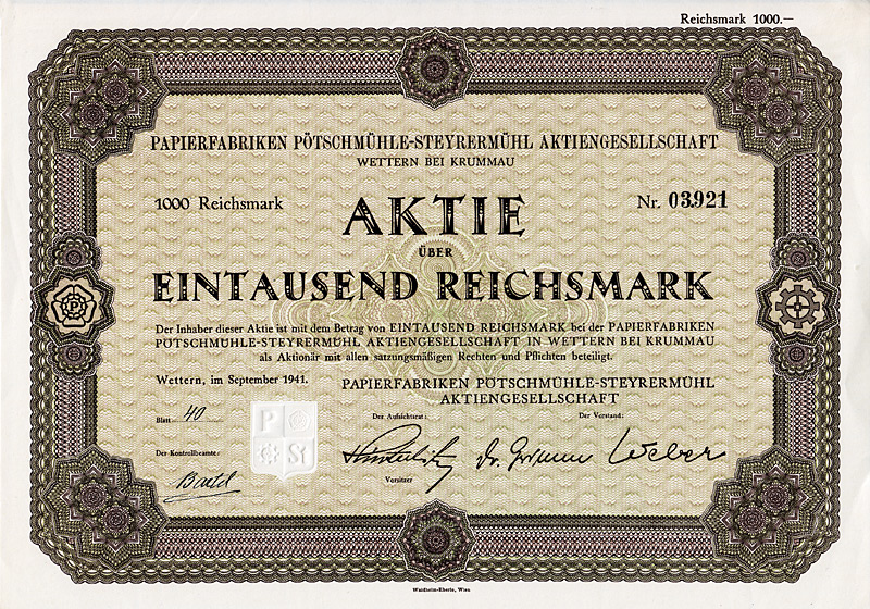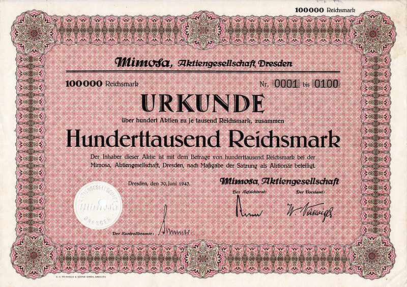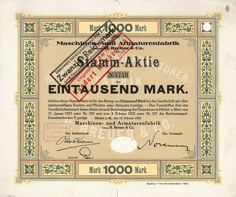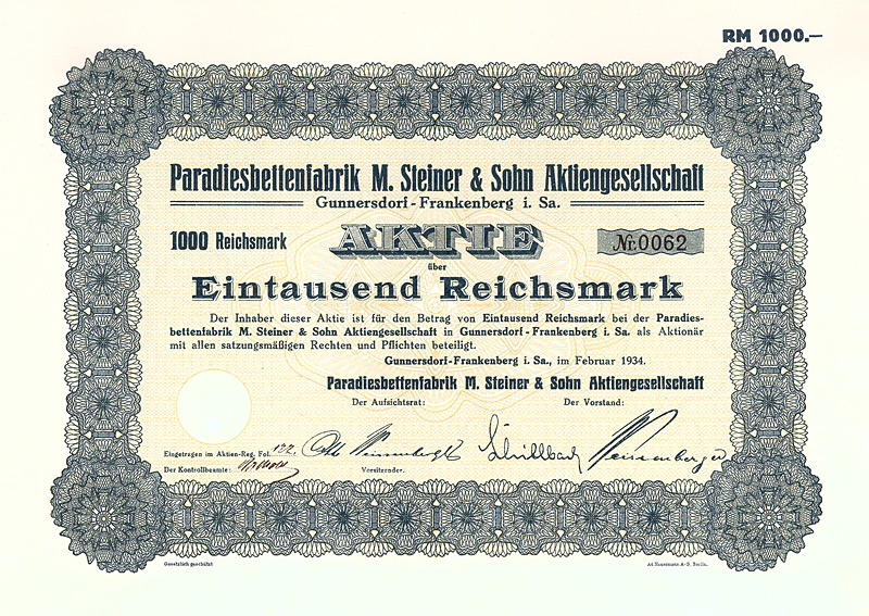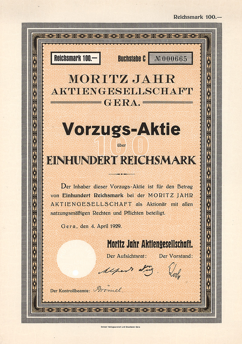 Auflage 900 (R 7). Gegründet 1861, AG seit 1888. Fabrikation von hochglänzenden Pappen, sog. Pressspan, zur Appretur von Stoffen, für Platten mechanischer Musikwerke etc. sowie Papier und Pappen aller Art. 1896 Ankauf der Fabrikanlage Brethaus bei Lauter. Börsennotiz Berlin. Die AG existierte bis 1956, anschließend Umwandlung in eine KG mit staatlicher Beteiligung (bis 1972). Danach VEB und als Werkteil der Pressspan- und Spezialpappenwerke Zwönitz bis 1992 fortgeführt, danach Pressspanfabrik Untersachsenfeld GmbH. Maße: 27,3 x 34 cm. Mit restlichem Kuponbogen.