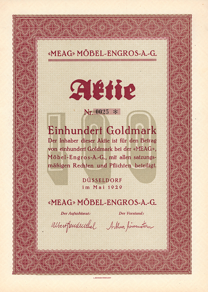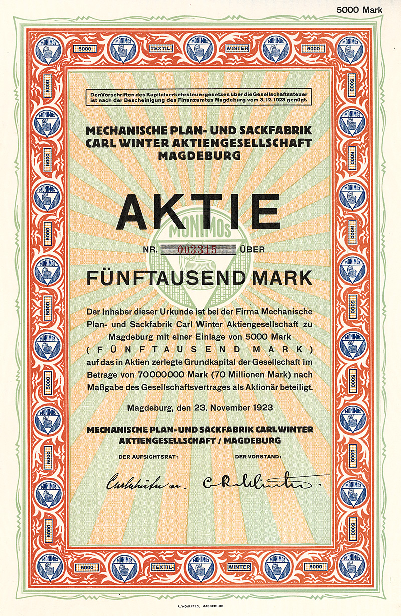 Auflage 10.000 (R 9). Gründung 1920. Betrieb von Spinnereien und Webereien für Segeltuche, Jutegewebe, Säcke, Planen und Wolldecken. 1922 Angliederung der Niedersächsischen Kunstweberei AG im Wege der Fusion. 1923 Fusion mit der Winsener Spinnerei und Weberei einschließlich des Elektrizitätswerkes, welches die Stadt Winsen mit Strom versorgte. Im Herbst 1925 in Konkurs gegangen. Großes Hochformat, Umrahmung mit Jugendstil-Elementen. Maße: 37,5 x 27,2 cm. Kleine Fehlstelle am rechten Rand unten. Mit Kupons.